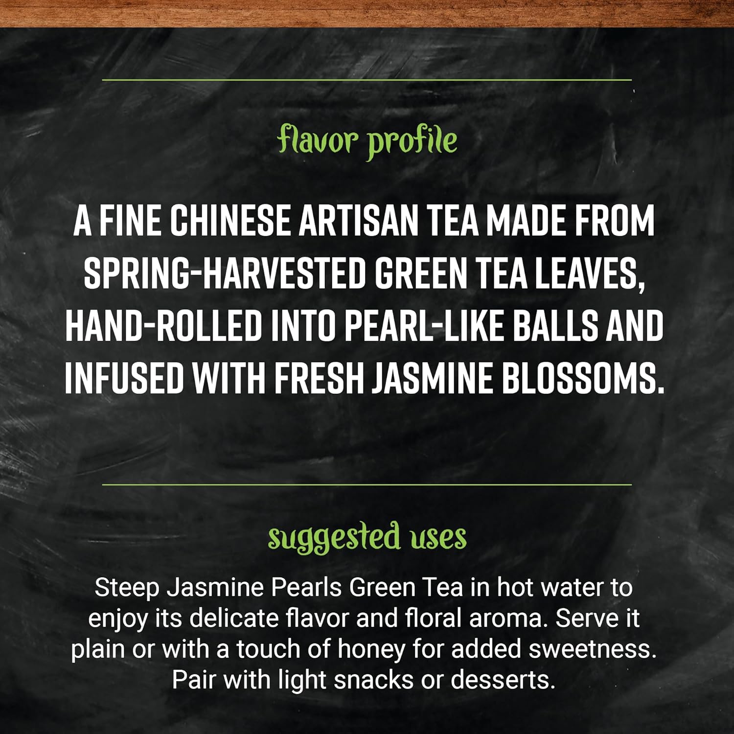 • JASMINE PEARLS GREEN TEA - Frontier Co-op Jasmine Pearls Green Tea is a meticulously crafted Chinese artisan organic green tea. It is made from intact growing tips, consisting of two leaves and a bud, delicately hand-rolled into pearl-like balls. This premium tea undergoes a special process where it is layered with fresh jasmine blossoms, imparting a unique and delightful flavor profile.