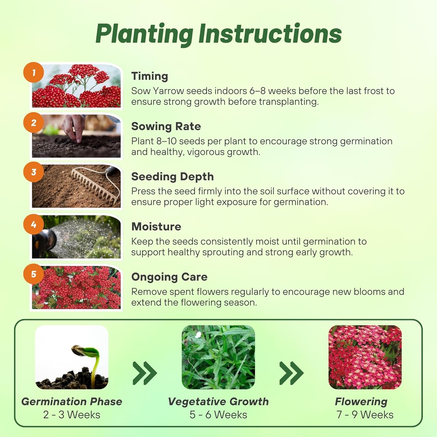 • VERSATILE USES & HARDY PERENNIAL: Our yarrow seeds for planting thrives in full sun, making it the perfect for xeriscaping and low-water gardens. Our hardy perennial flowers offers vibrant blooms from summer and fall with minimal care. Whether dried or boiled, they can be used to add an aromatic, flavorful twist to your tea, providing a unique, fragrant experience.