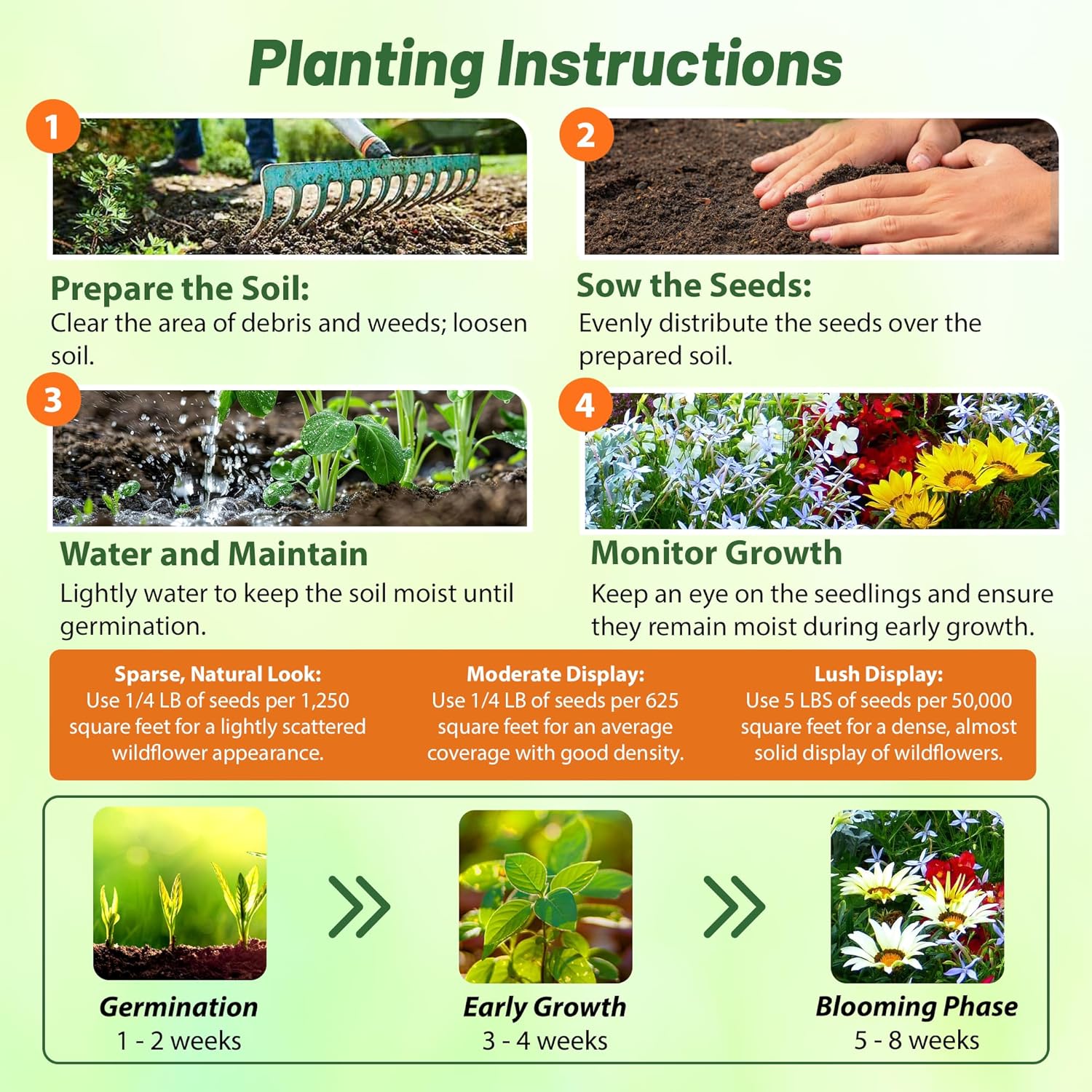 • FLEXIBLE SEEDING RATES: Sowing rate of 1/4 LB per 625-1,250 SF or 5 LBS per 25,000-50,000 SF. Perfect for various applications, from backyard flower beds to large meadows. The bulk wildflower seeds are also drought-tolerant and deer-proof, making them an excellent choice for sustainable gardening.