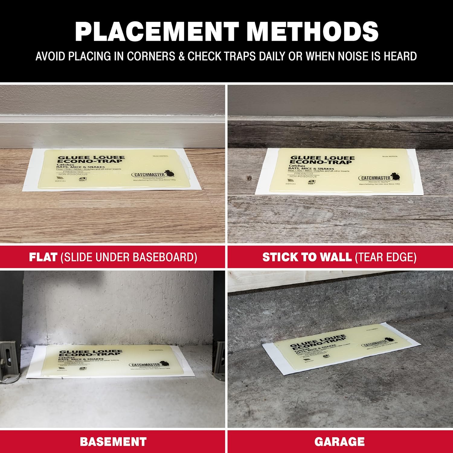 • YEAR-ROUND CONTROL: Catchmaster glue traps for mice and rats are pesticide-free and mess-free. The mouse and rat trap is an effective and easy solution for insect and rodent problems. When placed in an area with normal conditions, rodent and spider traps for inside your home can last up to one full year.