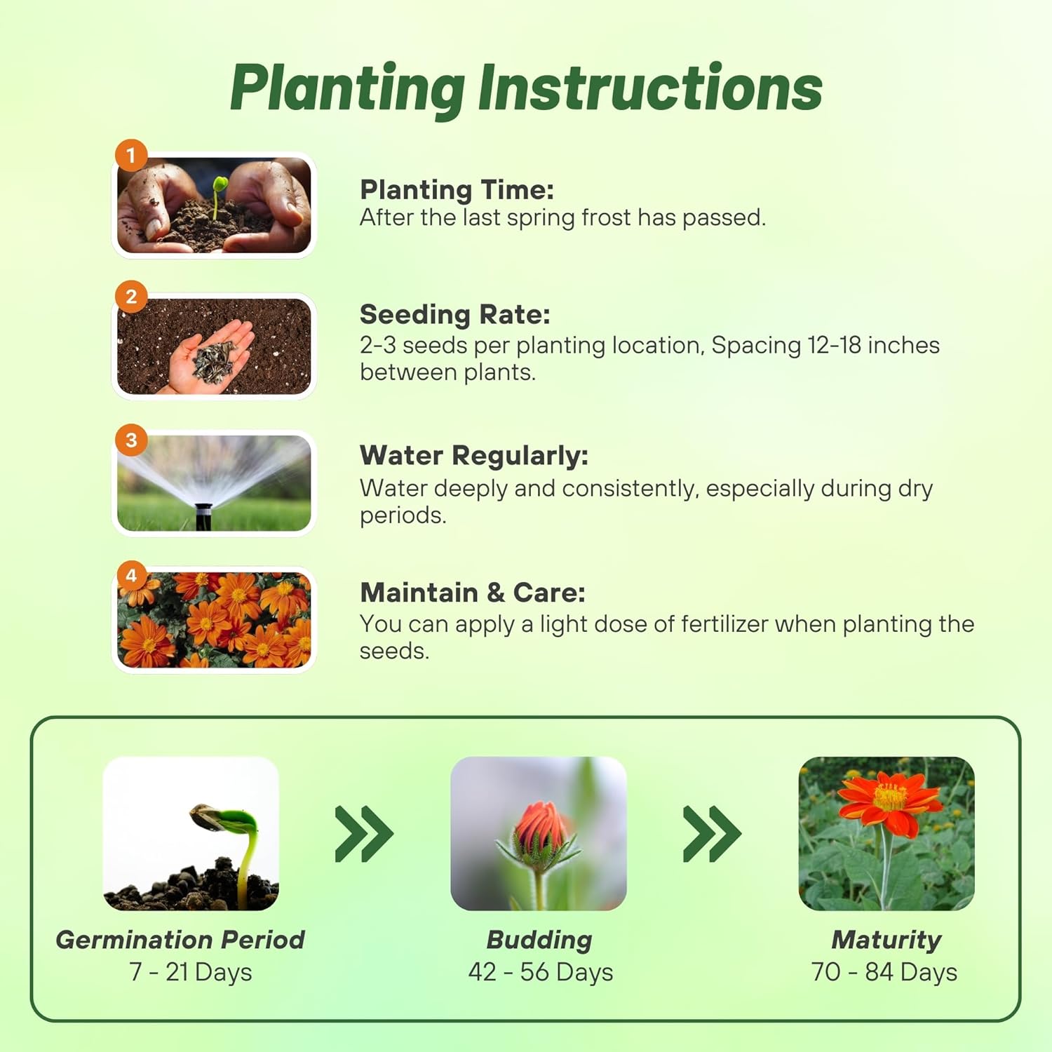 • STUNNING ORANGE BLOOMS: Our Mexican sunflower seeds produce 3-inch, vibrant orange flowers that brighten flower beds, borders, and landscaping designs. These blooms are also great as cut flowers, enhancing arrangements with bold color. Perfect for gardeners seeking flower seeds to plant outside.