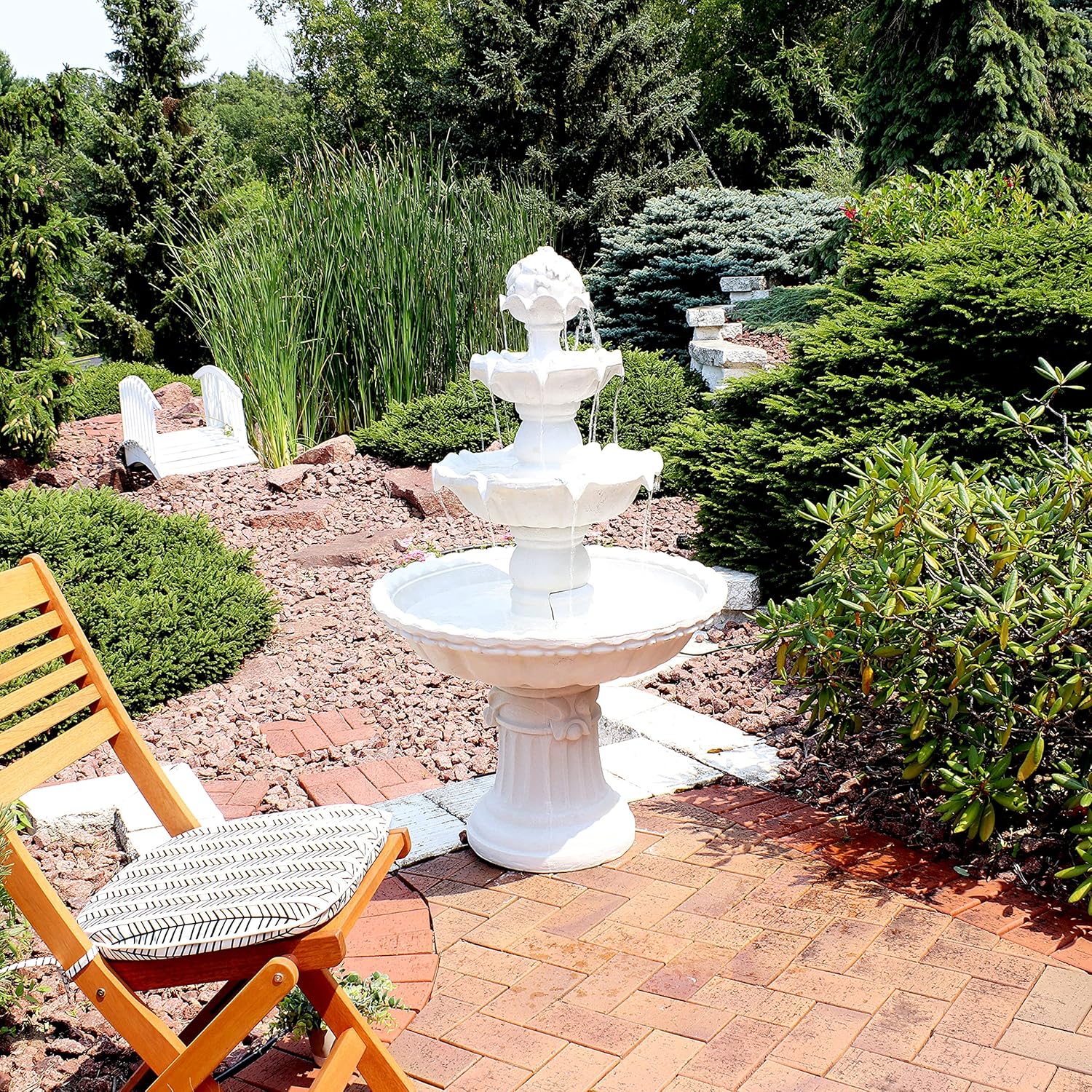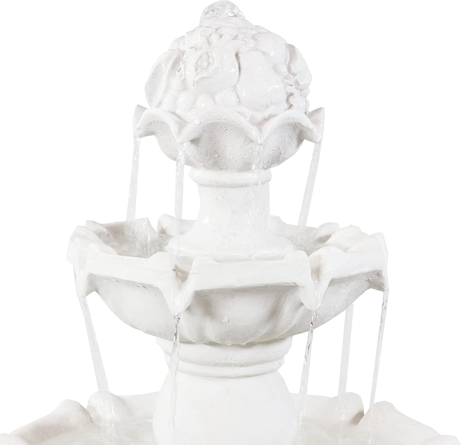 • ELEGANT FOCAL POINT: The 3-tiered design with a fruit topper and white finish adds a sophisticated touch to gardens, patios, or landscaped areas. The backyard water fountain measures 31" in diameter x 52" H with a 14.5" diameter base. The fountain weighs 50 lbs and has a 8.5-gallon water capacity.