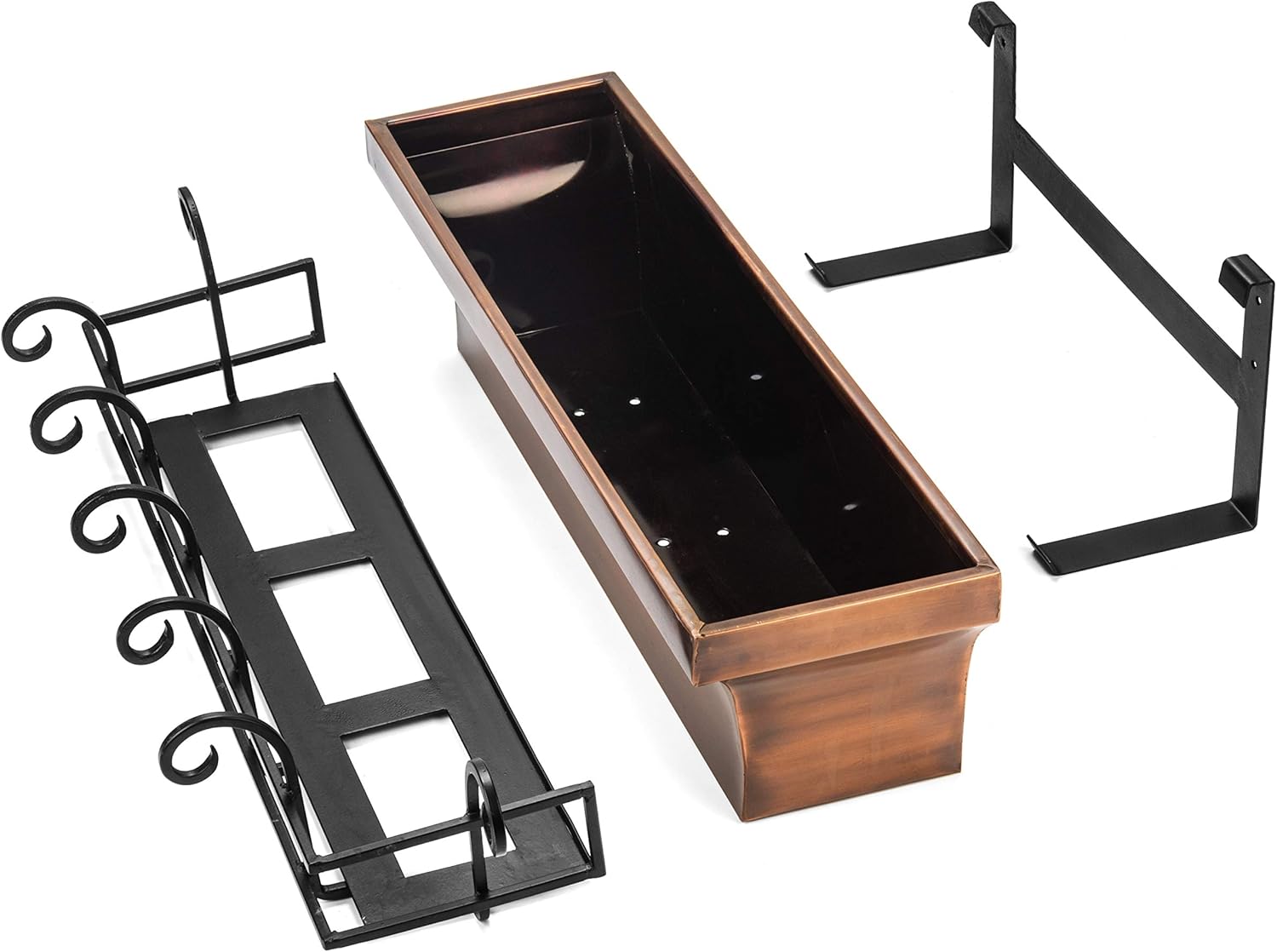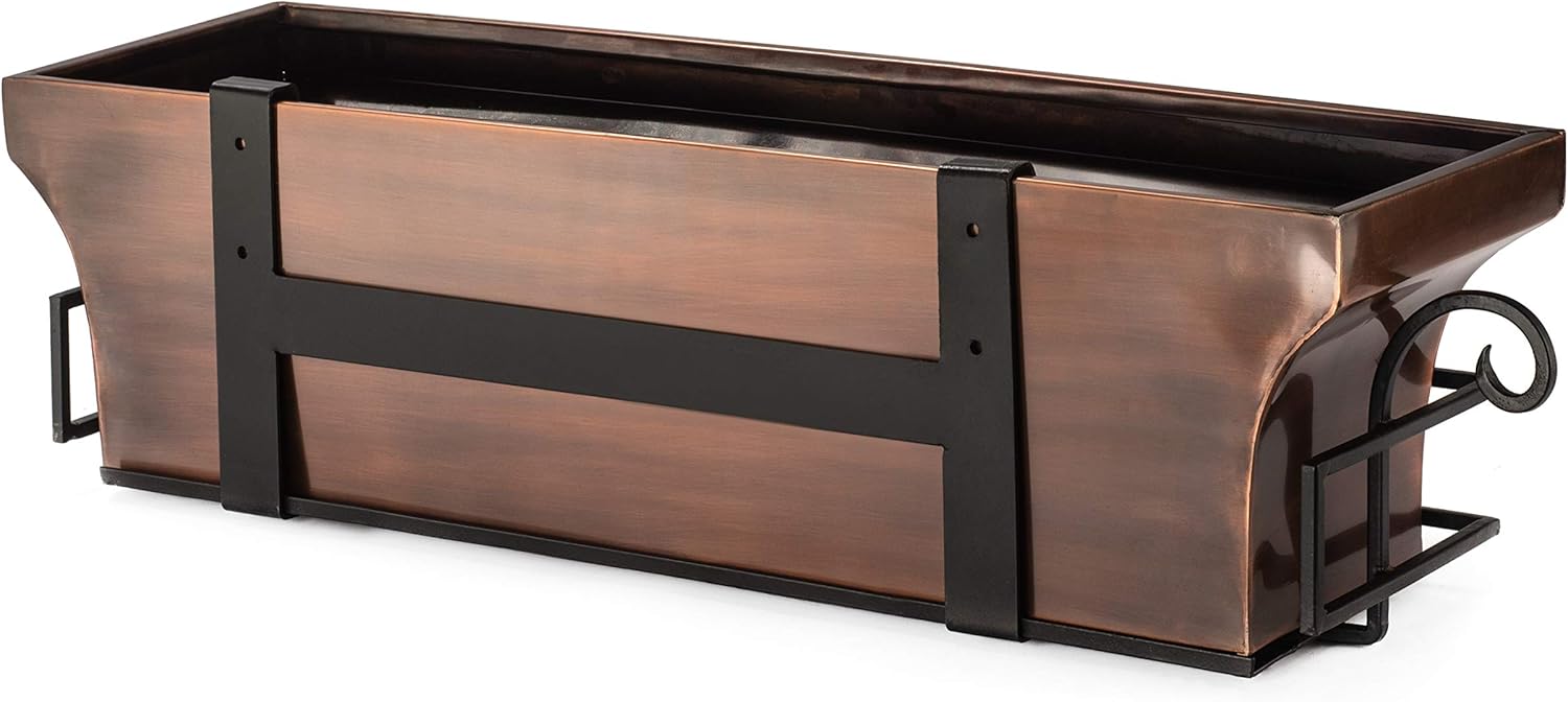 • Sturdy window boxes for the home – The rich color of this flared window box adds an extra layer of depth to any outdoor decor. The antique copper finish is perfectly paired with the black powder coat of the frame, and is accentuated by the scroll work on the frame. The wide mouth at the top of the window flower box allows your flowers to breathe and grow throughout the box. The sturdy but lightweight design allows the easy to remove brackets to functionally support the window box.