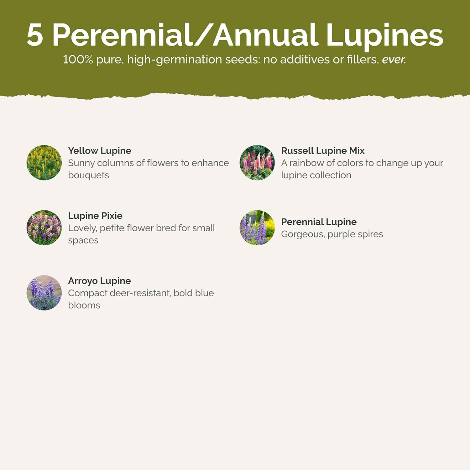 • 100% Pure, Non-GMO Seeds - No fillers, favorites only! Includes 7 easy-to-grow species: Russell Lupine, Arroyo Lupine, Wild Perennial Lupine, Dwarf Lupine Pixie, Pygmy Leaf Lupine, Sky Lupine, Yellow Lupine