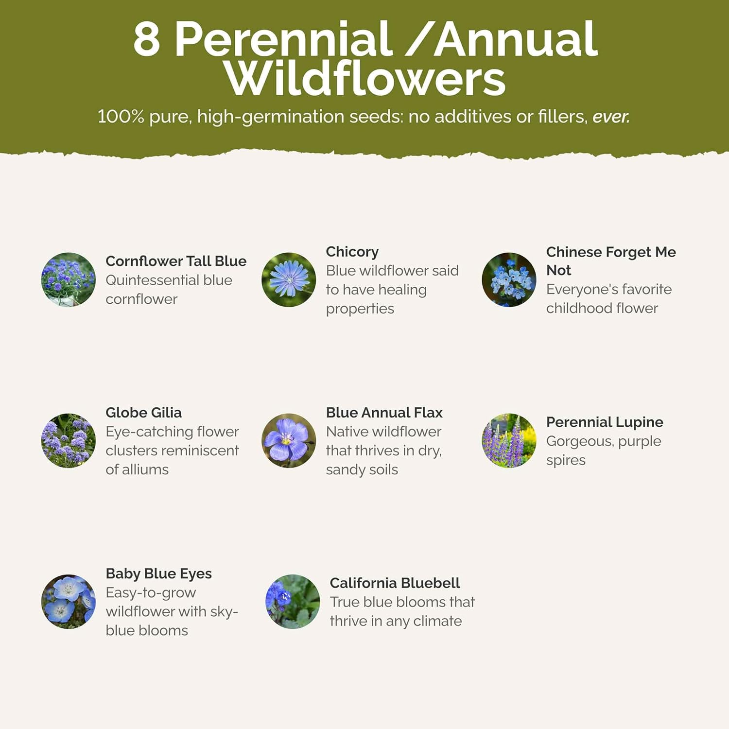 • 100% Pure, Non-GMO Seeds - No fillers, favorites only! Includes 9 easy-to-grow species: Annual Blue Flax, Wild Perennial Lupine, Baby Blue Eyes, Chicory, Cornflower Dwarf Blue, Blue Columbine, Chinese Forget Me Not, Globe Gilia, California Bluebell