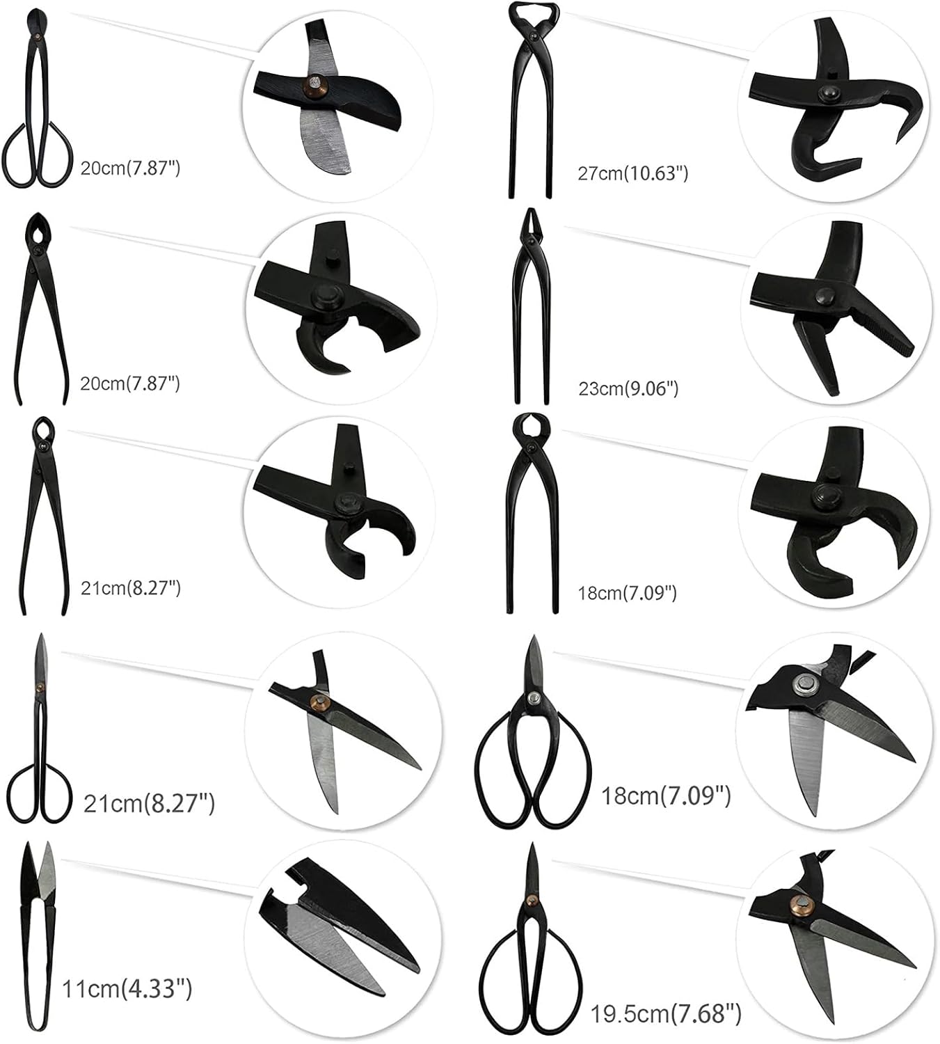 • Complete 14PCS Bonsai Tools Set - including Leaf Trimmer, Bud Shear, Cutting Scissor, Concave Cutter, Knob Cutter, Wire Cutter, Root Cutter, Jin Pliers, Trunk Splitter, Root Hook, Rake with Spatula, Branch Bender, Hemp Broom, Wire, Nylon Tool Case