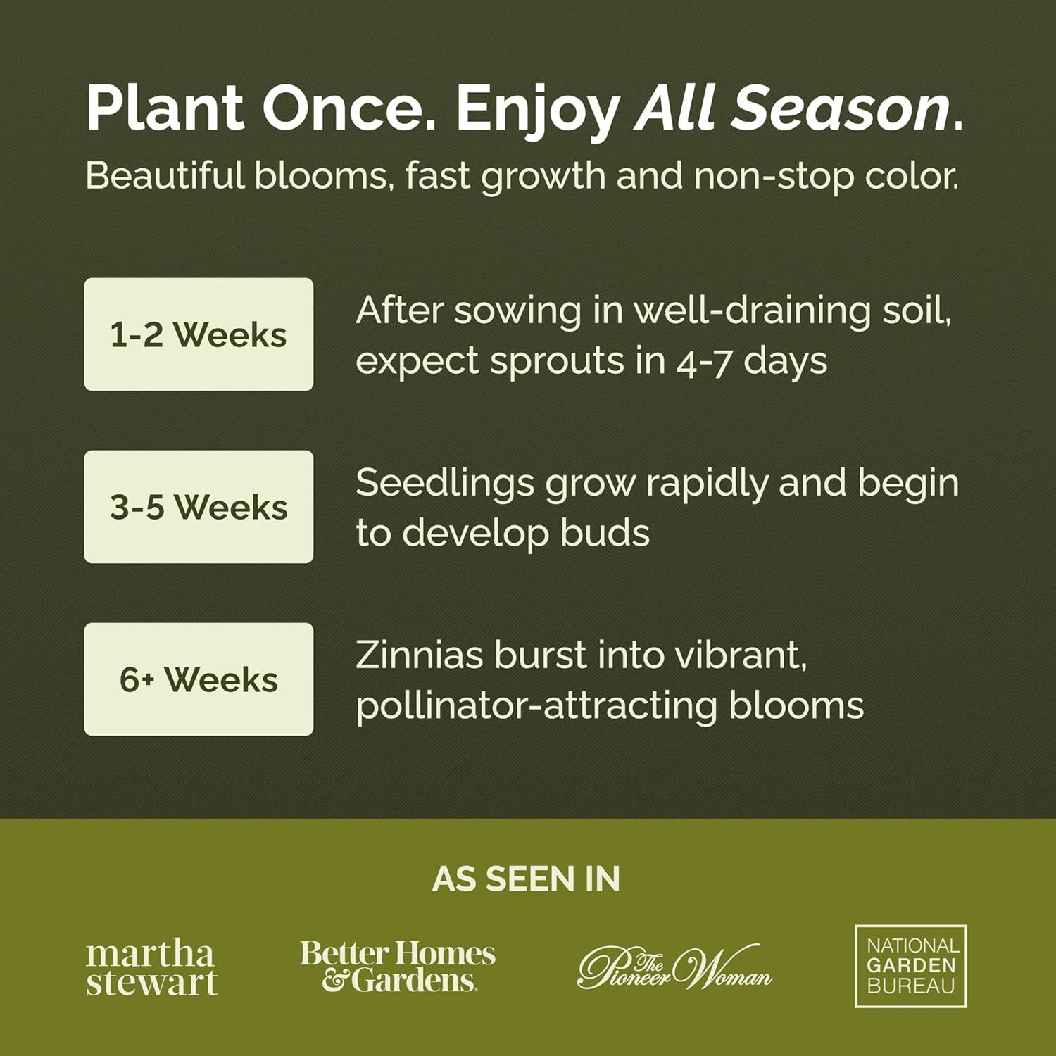 • 100% Pure, Non-GMO Seeds - No fillers, favorites only! Includes 6 easy-to-grow species: Zinnia California Giant, Zinnia Dahlia Flowered, Zinnia Pumila, Zinnia Lilliput, Zinnia Thumbelina, Mexican Zinnia