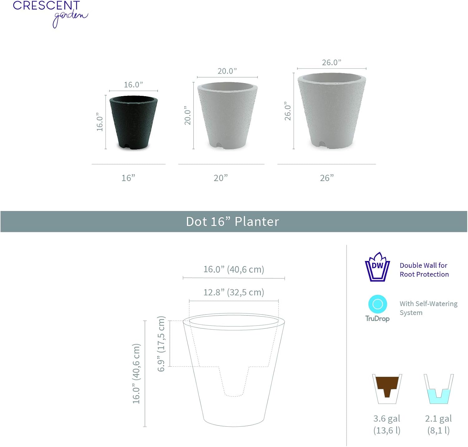 • DOUBLE WALL: This indoor planter’s double wall makes it shock-resistant and protects the plant’s roots from extreme temperatures. Measurements: Soil capacity: 3.6 gal.; water capacity: 2.1 gal.; base diameter: 9.8"; inner dimensions: 12.8" W x 6.9" H.
