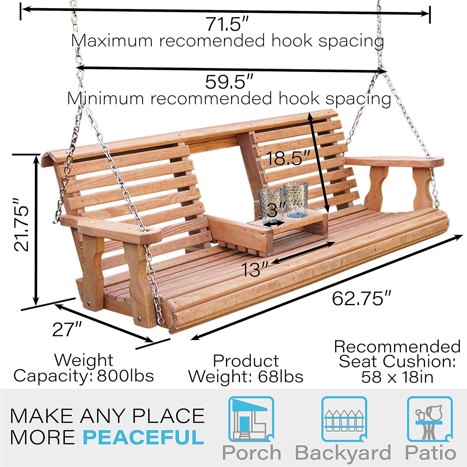 Porchgate Amish Heavy Duty Console Porch Swing with Fold Down Cup Holders in Cedar Stain - Amish Made in The USA from Treated Pine, Hanging Chains Included