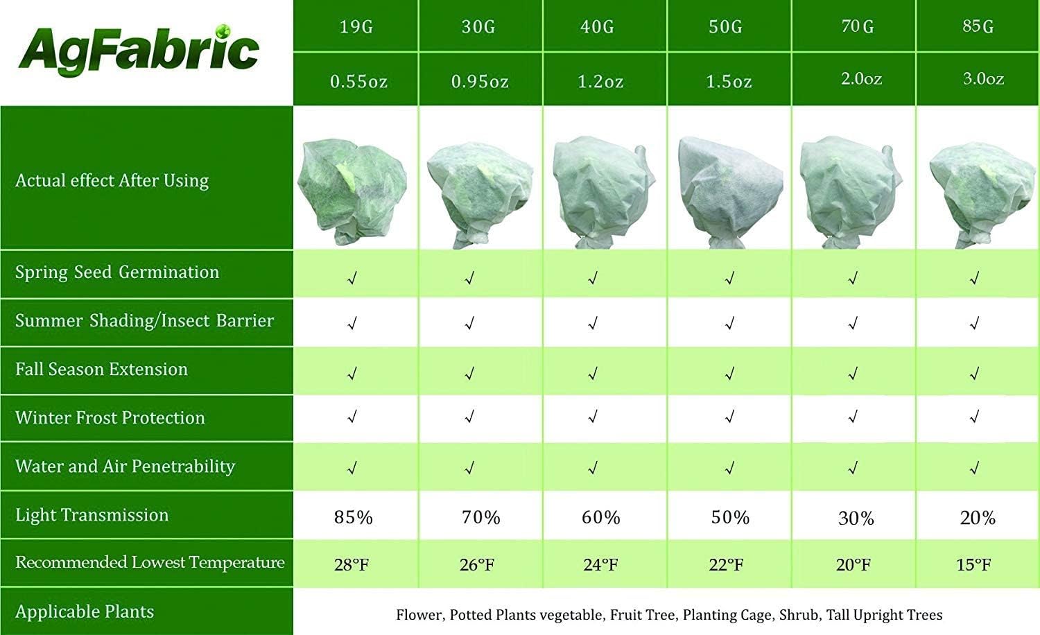 • SUITABLE SIZE Perfect for Plant size 50''-60" high and 50" -60'' round, Heavy-weight FRCs (0.95 oz./sq. yard): Are usually used to extend the growing season in spring and fall, allow 30%-50% light transmittance, and recommend 3°-8°F. of frost protection.