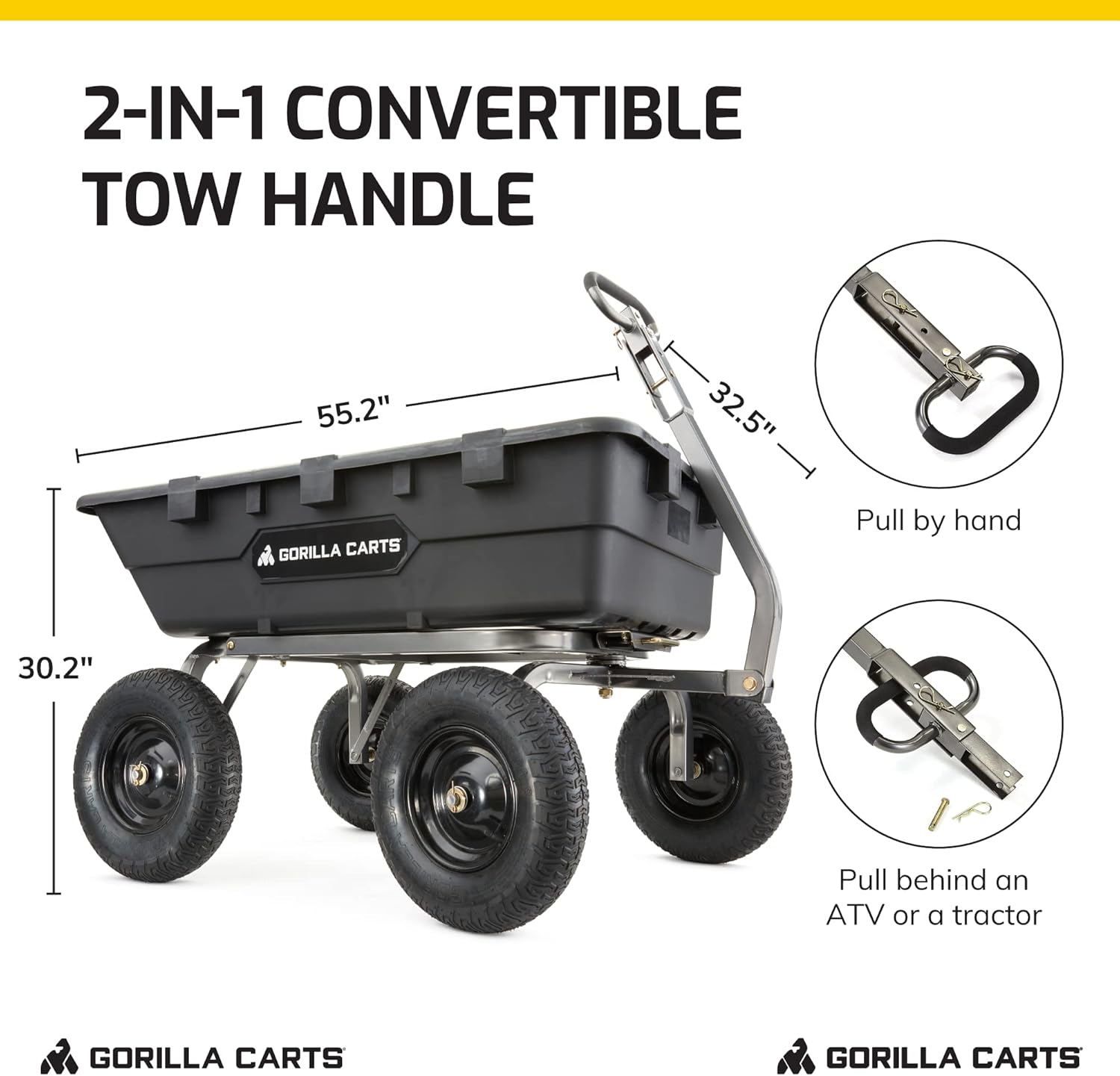 Gorilla Carts Heavy-Duty Poly Yard Dump Cart, 10 Cu Ft Tub, 1500 lb Haul Capacity, Black – Towable Utility Wagon with Quick-Release Dumping & Pneumatic Tires for Landscaping and Gardening