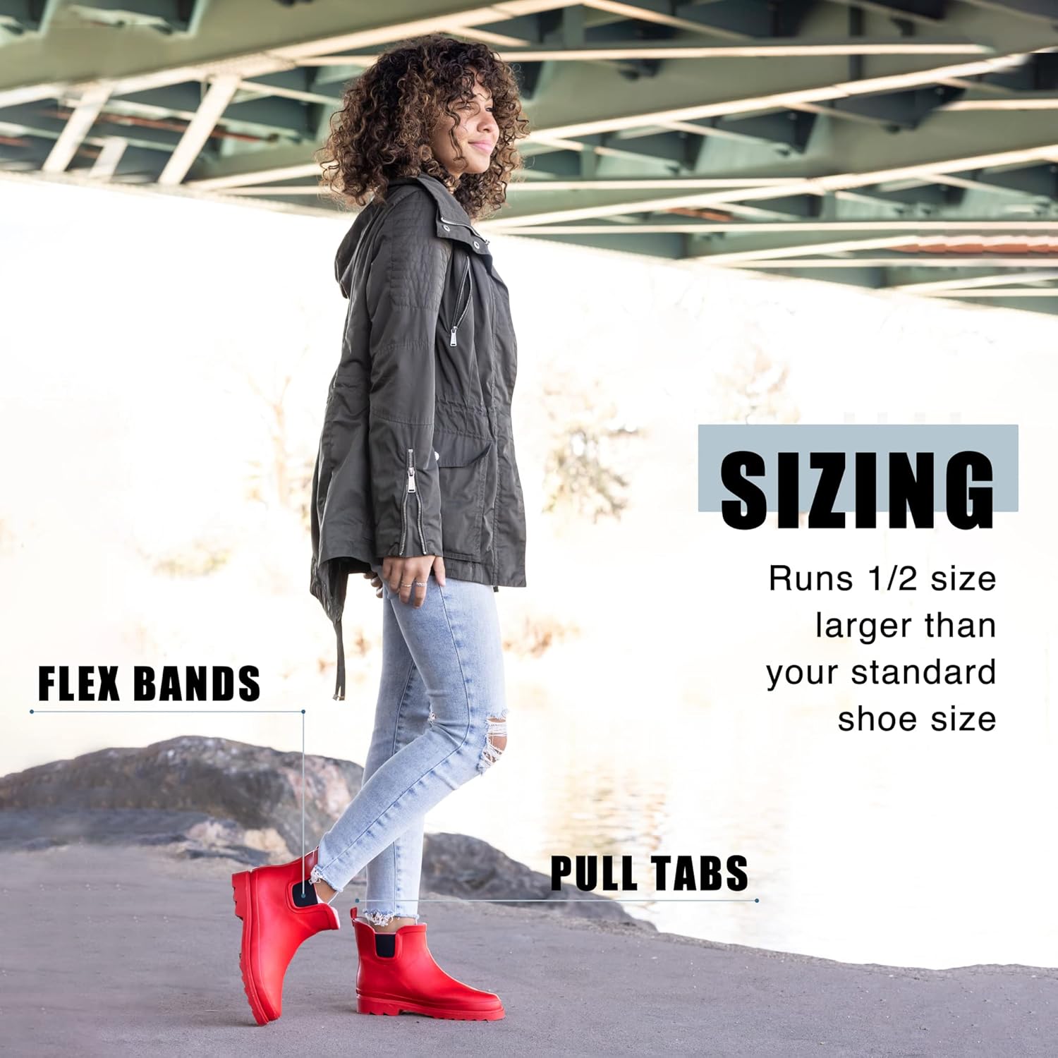 • RUNS A HALF-SIZE LARGER: With extra room for thick socks, these ankle rain boots keep feet warm on colder than cold days. Size Info: US Size: 6, 7, 8, 9, 10, 11 - EUR Size: 37, 38, 39, 40, 41, 42 - Foot Length: 9.25", 9.50", 9.75", 10.00", 10.50", 10.75" Shaft circumference is 12" with boot height of 6" for all sizes