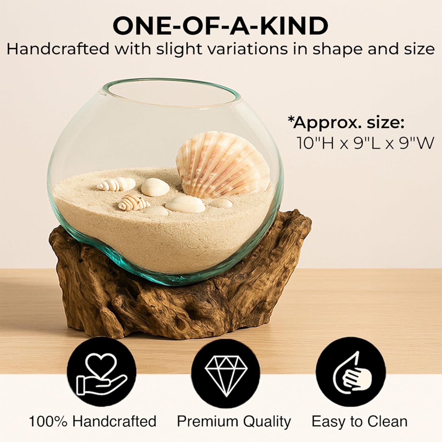 • ECO FRIENDLY BEAUTY: Our hand-blown bubble glass terrarium is as beautiful as it is unique. Each one is different from the next, providing you with a one-of-a kind planter, centerpiece, succulent garden or air plant display. Hand-crafted from glass and driftwood by artisans in Bali, Local artists used blow pipes to transform melted shards of collected scrap glass into a one-of-a-kind bowls that fit snugly into the driftwood-root base.