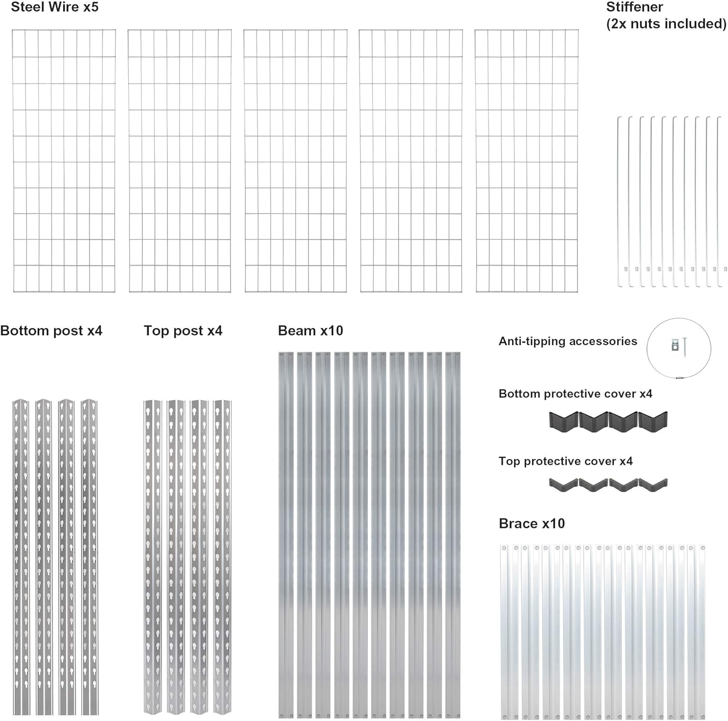 • One double post (vertical or horizontal) heavy duty storage shelving unit with assembly Instructions and anti-tipping accessories