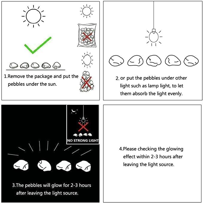 • No Batteries Required to Shine: These glow in the dark stones charge using sunlight or LED light. Simply let them absorb light for 1-2 hours, and they will glow for an extended period. A quick LED test can be done beforehand to check their glowing effect