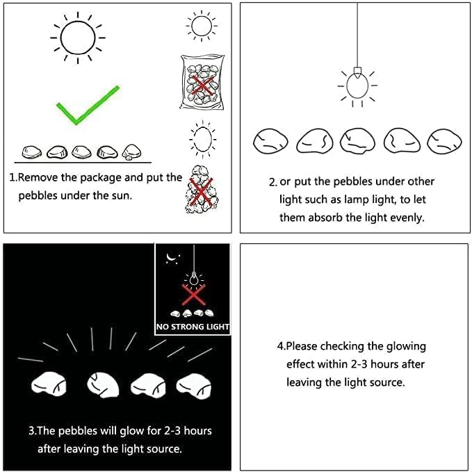 • 100% SATISFACTION OR FULL MONEY BACK - Your satisfaction is our NO.1 priority. If the pebbles do glow, please contact us first. We will replace them for you.