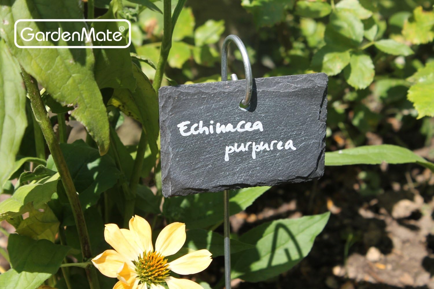 • Set of 5 slate plant labels designed to hang from the metal rods