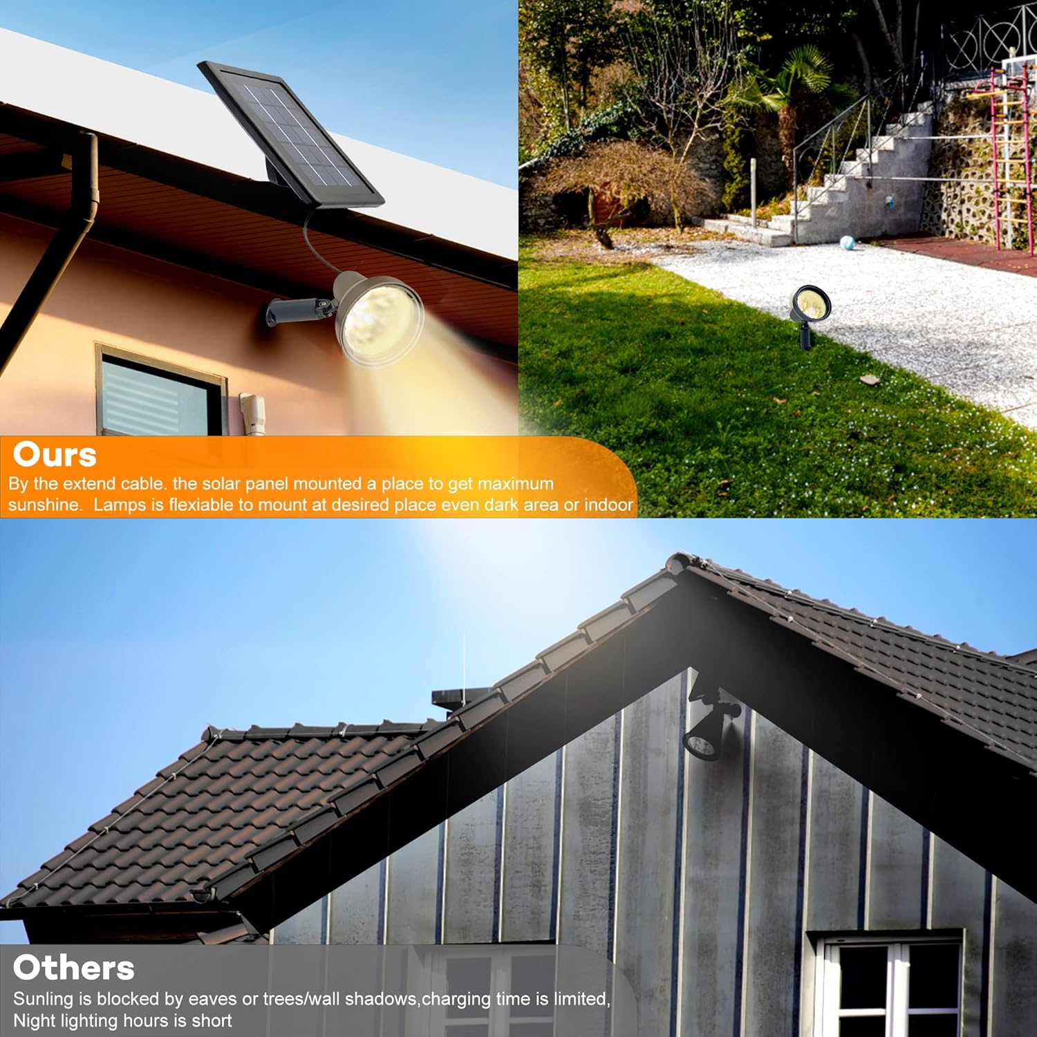 • 【Solar Light With Separate Solar Panel】Waterproof 16.4Ft Extension Cables to Let You PLACE The Spotlights at Favorite Places Even NO SUNSHINE or Indoor.Two-Ways Mounting: Stick into the ground with stakes