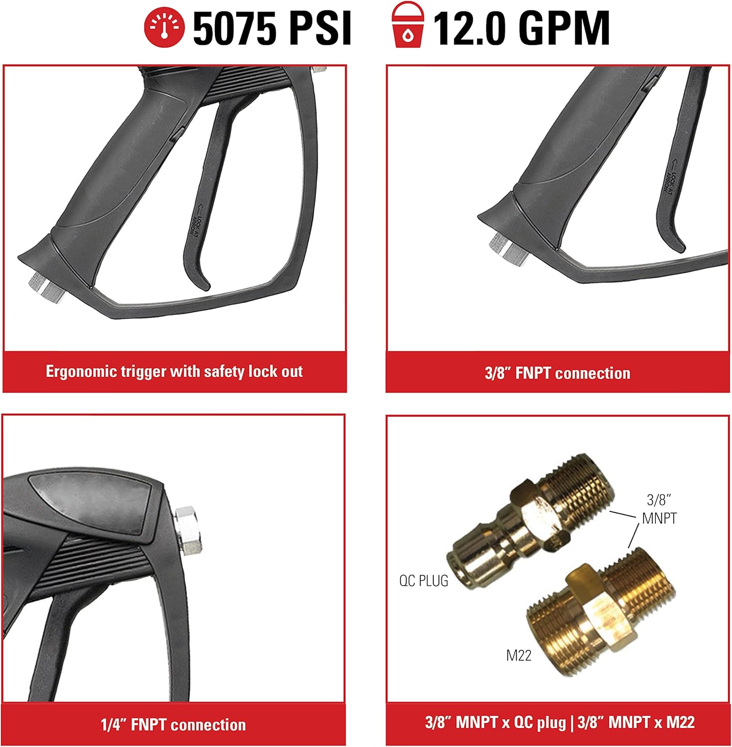 • Easy to use: This Spray Gun features threaded 3/8” FNPT inlet and 1/4" FNPT outlet for most hoses and spray wands; Universal fit that is easy to hook up to most high pressure hoses and spray wands with the Threaded M22 and Quick Connect (QC) adapters included