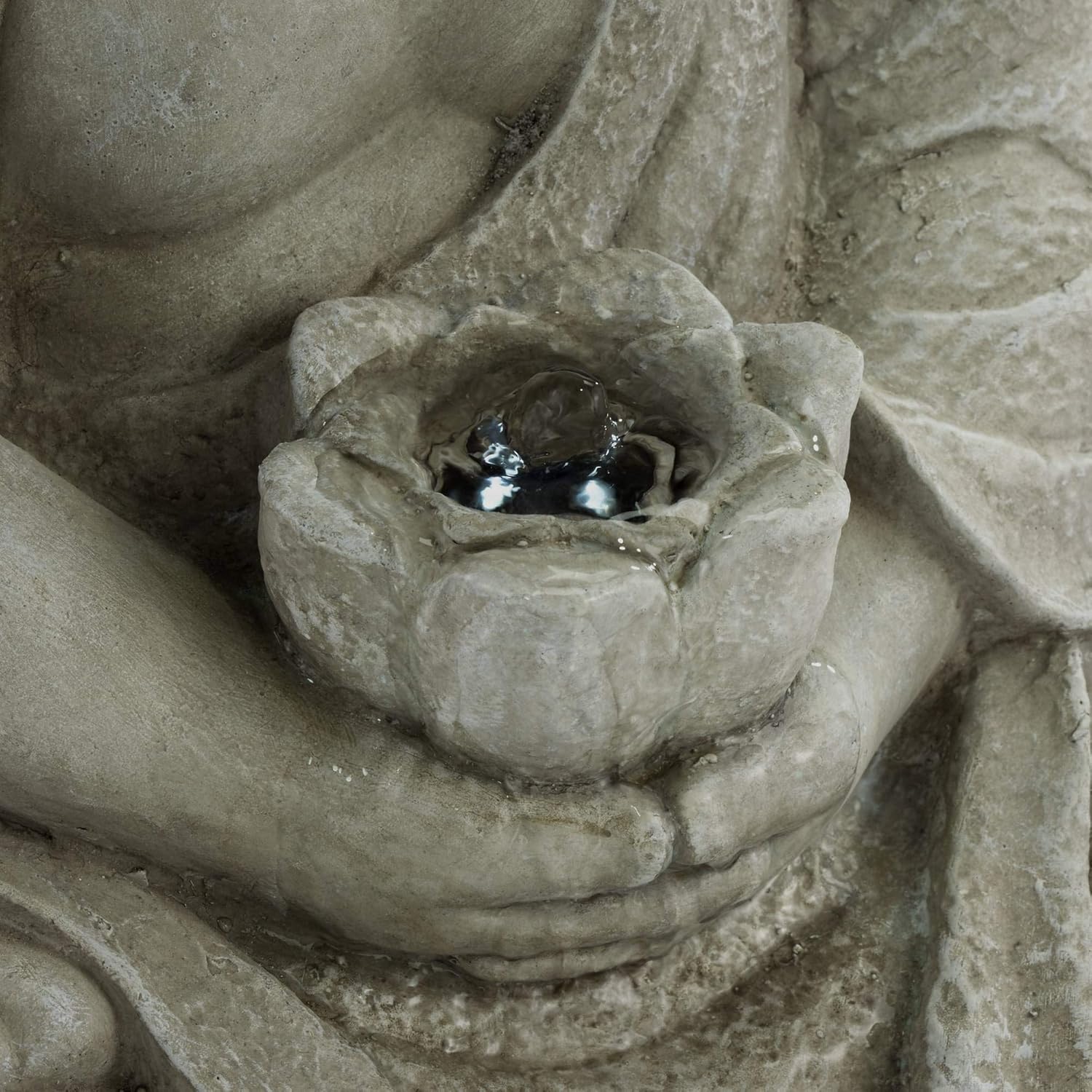 • 【Specifications】 22" high x 11 1/2" wide x 11 1/2" deep. Weighs 16.5 lbs. Serene sitting Buddha fountain with a lotus flower. By John Timberland.