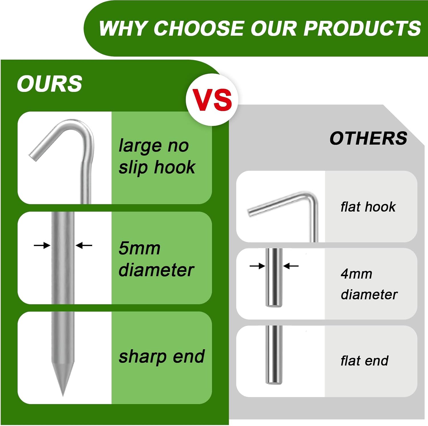 • ROBUST CONSTRUCTION- 6 Ga(5mm) diameter heavy duty Steel rod ultralight tent stakes with galvanized finish for superior rust-resistance, 56% stronger than 4mm steel garden stakes, stronger than Aluminum camping stakes.