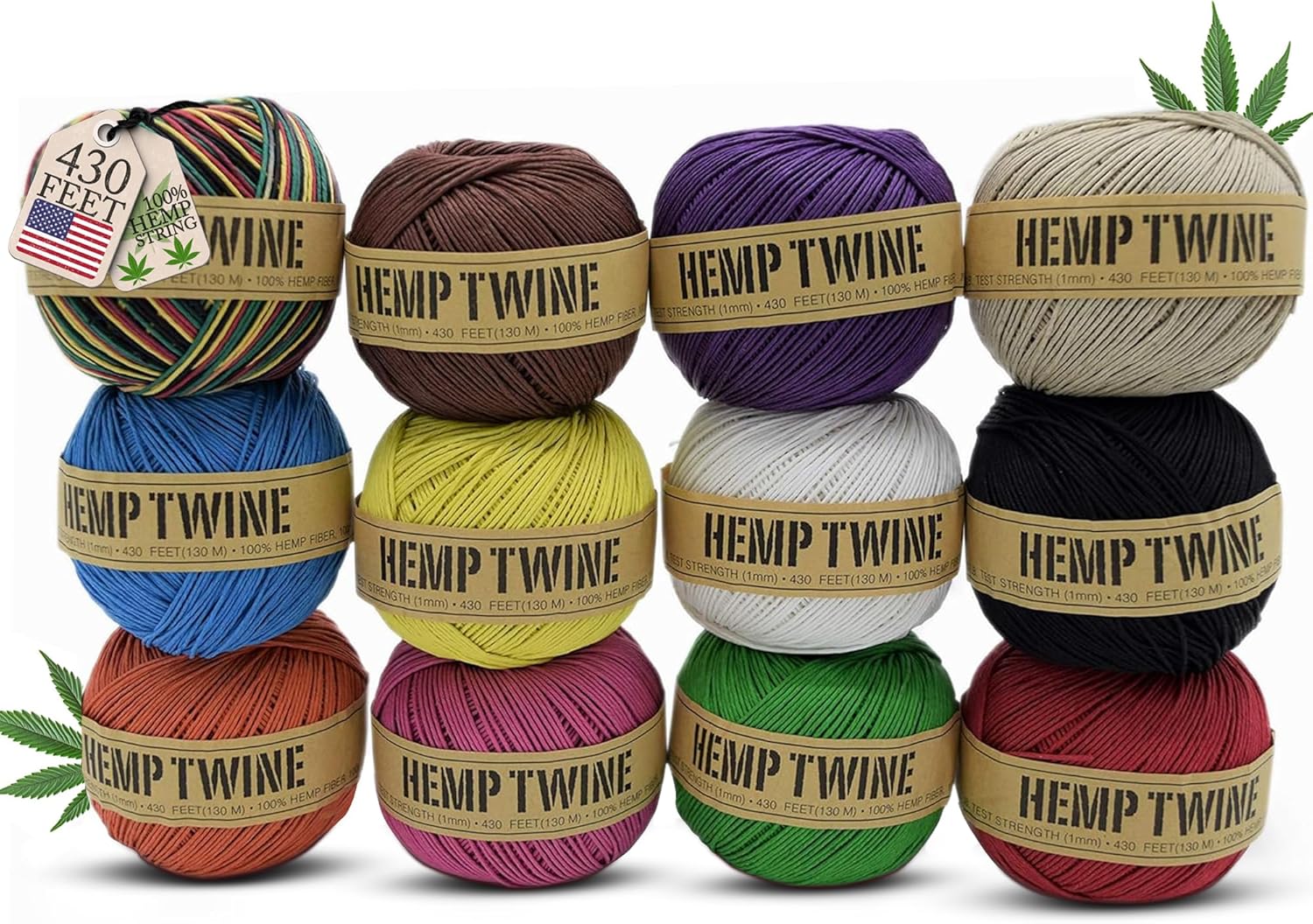 Hemp Twine for Gardening - Twine for Crafts - Organic Natural Hemp String for Jewelry Making - Strong Durable Cord for Decoration, Macrame + Cooking - 1MM, 100G/430 Ft. - 20 lb. Test Strength - 12 Pk