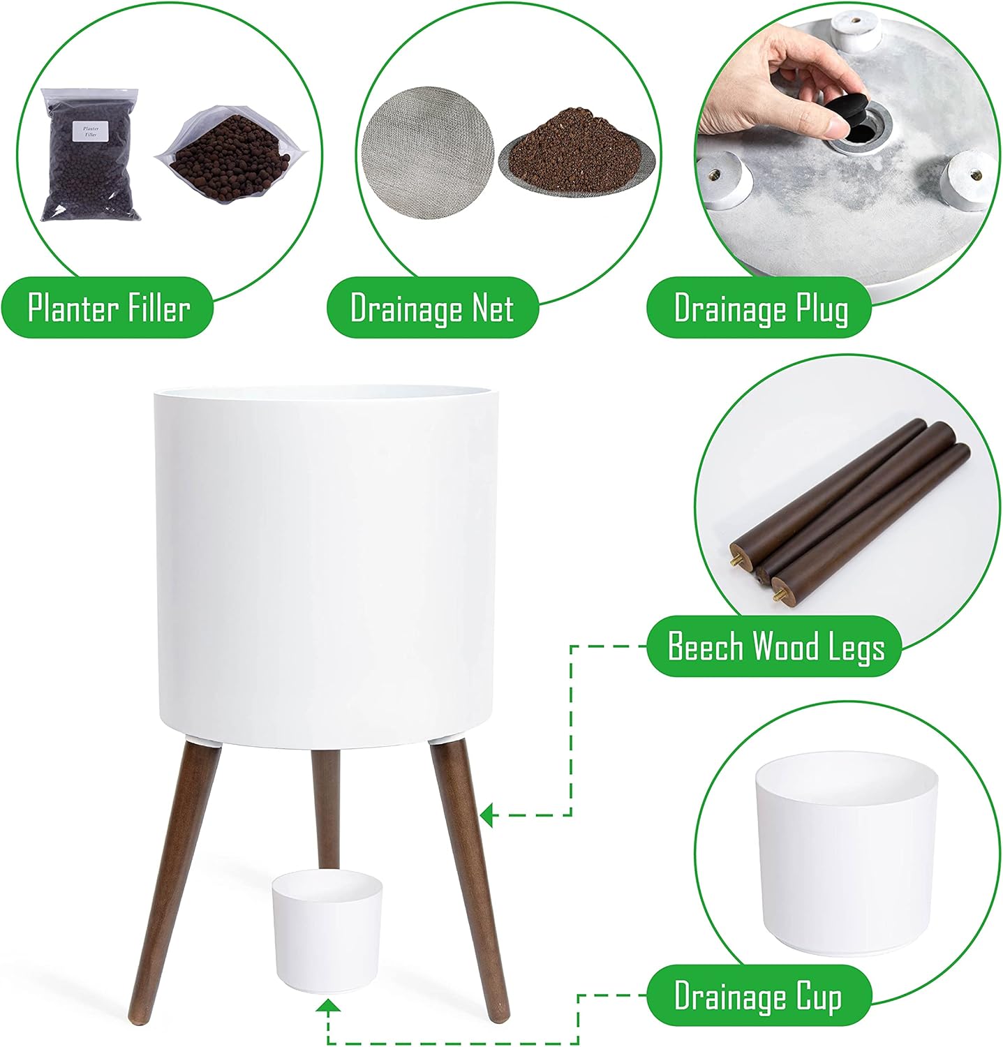 • Plants enthusiast accessories - drainage mesh net, optional plug, water catch cup, small bag of ceramic plant fillers.