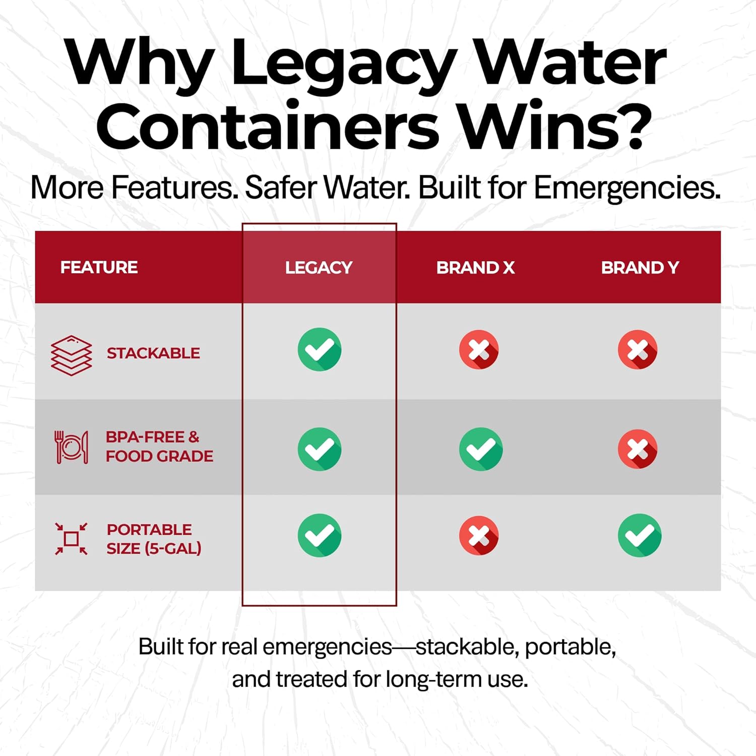 • At Legacy Food Storage, our focus is to provide families and individuals with the highest quality food and water storage available online. We look forward to delivering the peace of mind and comfort you'll receive knowing that you are prepared, regardless of what the future holds.