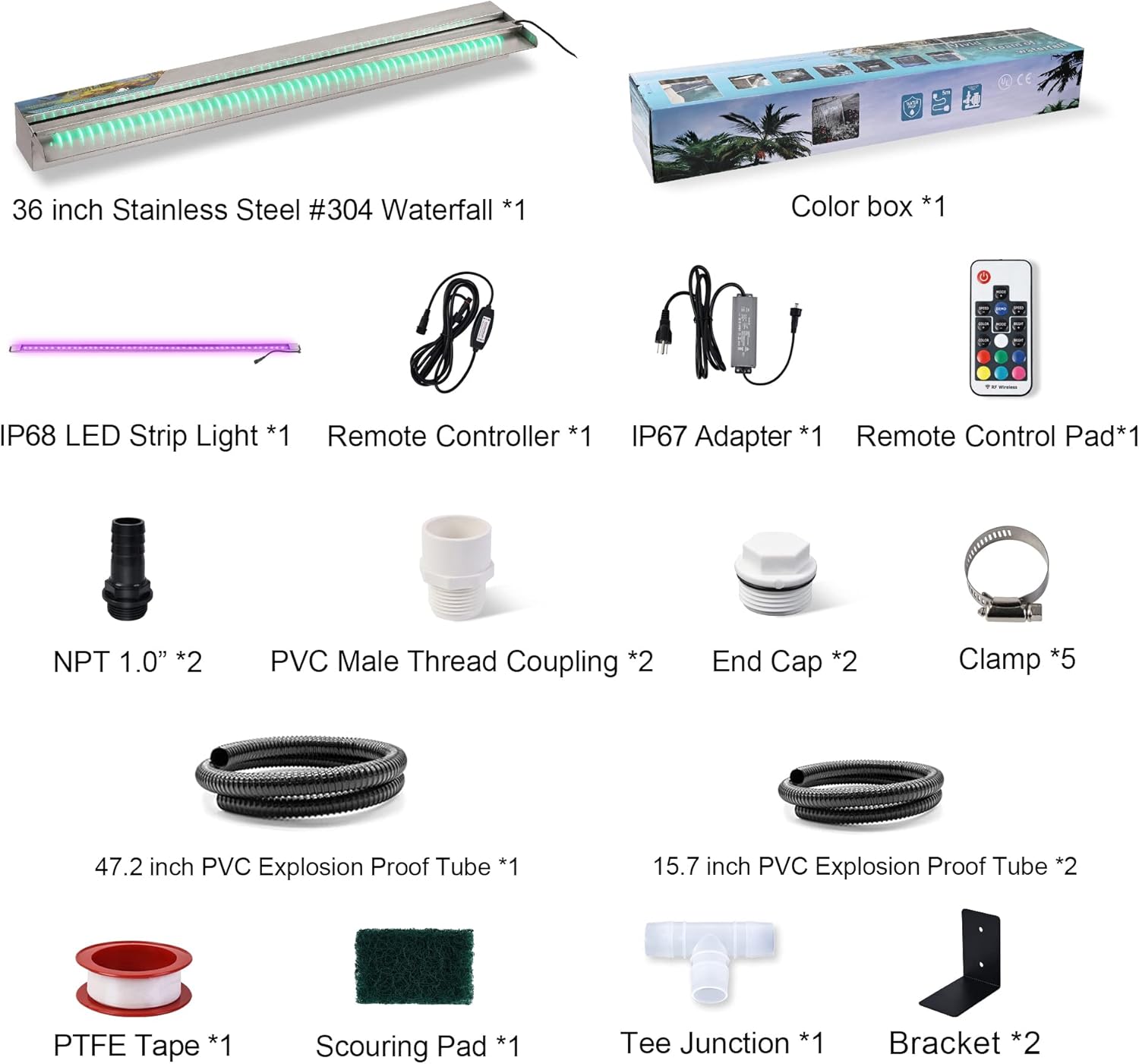• Great Decoration - LED-lighted waterfall spillway makes your garden elegant, fashionable, and beautiful. The color changed as you like with the gentle sound of water running make your patio more special at night. It comes with a 304 stainless steel spillway, IP68 LED strip, IP67 adaptor, RF remote, supply cord, and 1.2” female PVC pipe adapter