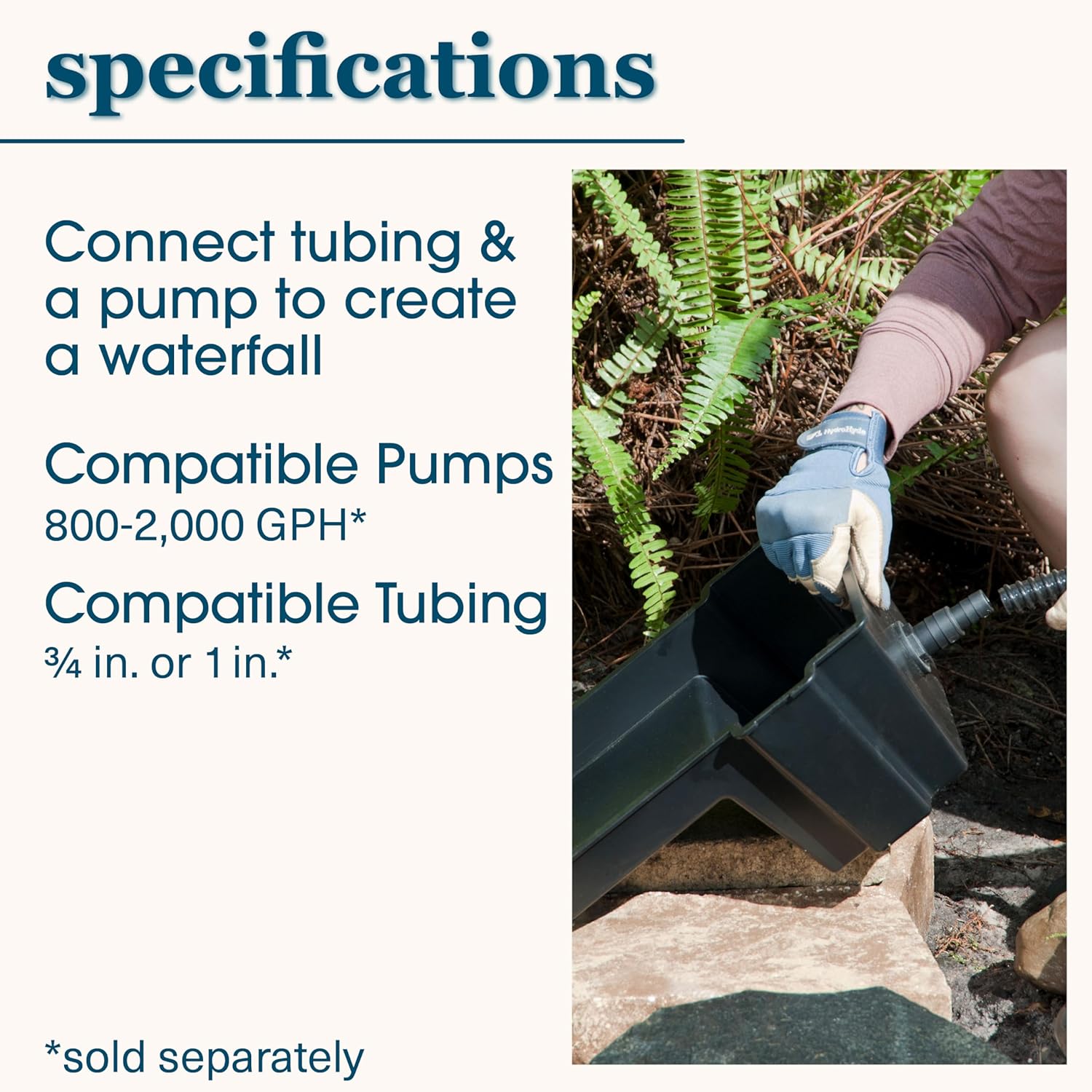 • EASILY AND SEAMLESSLY ADD A WATERFALL: The 8 in. Wide Waterfall Spillway can be added to a pond or disappearing water feature, blending in with its black color and adding the sights and sounds of water to your outdoor space.
