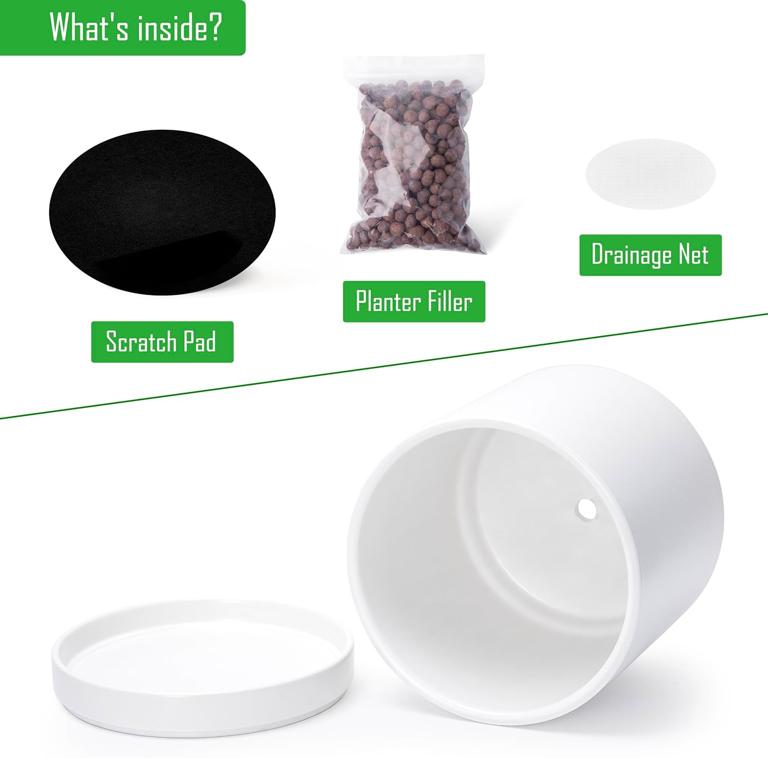 • Planter pot with drainage hole, mesh drainage net and protective scratch pad included.