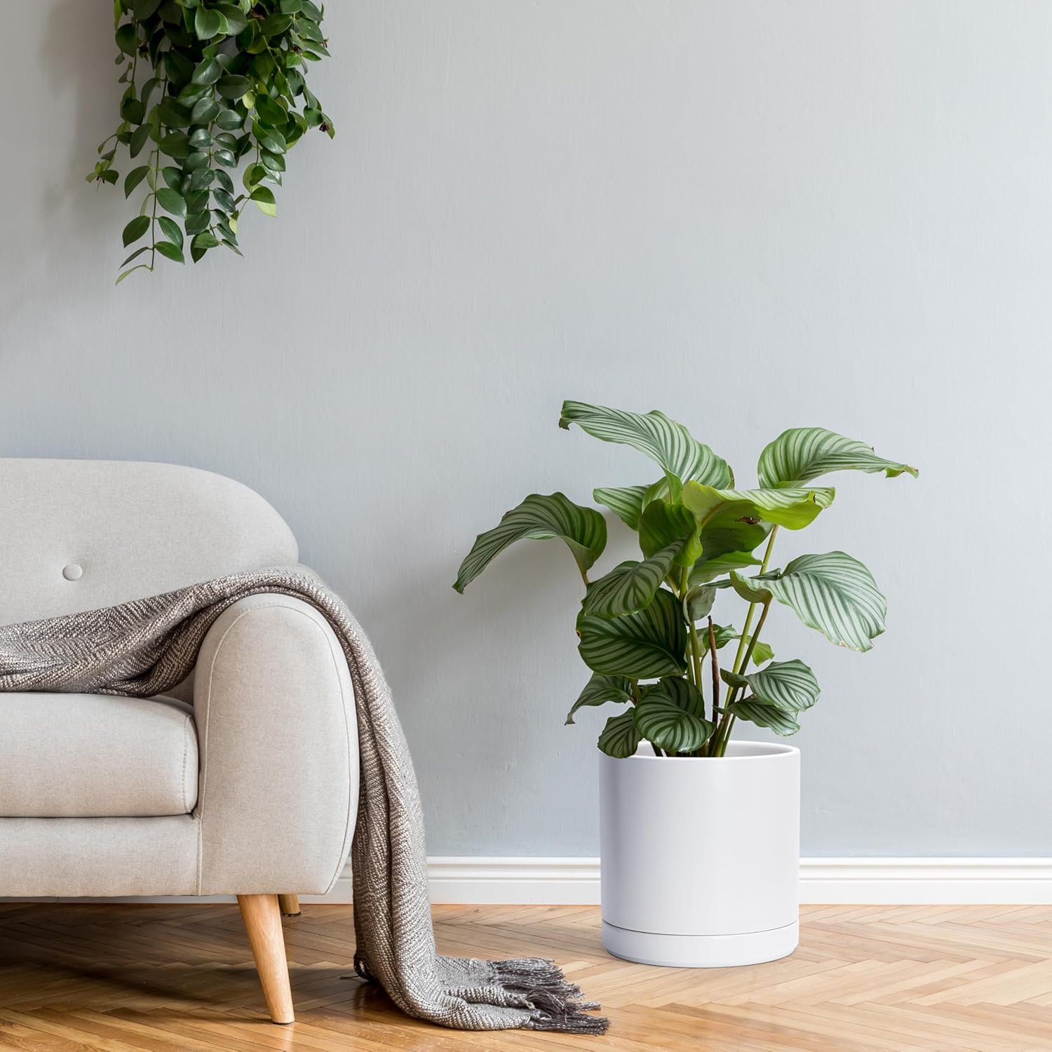 • Simple, elegant, and modern cylindrical straight round planter pot with saucer and drainage hole.