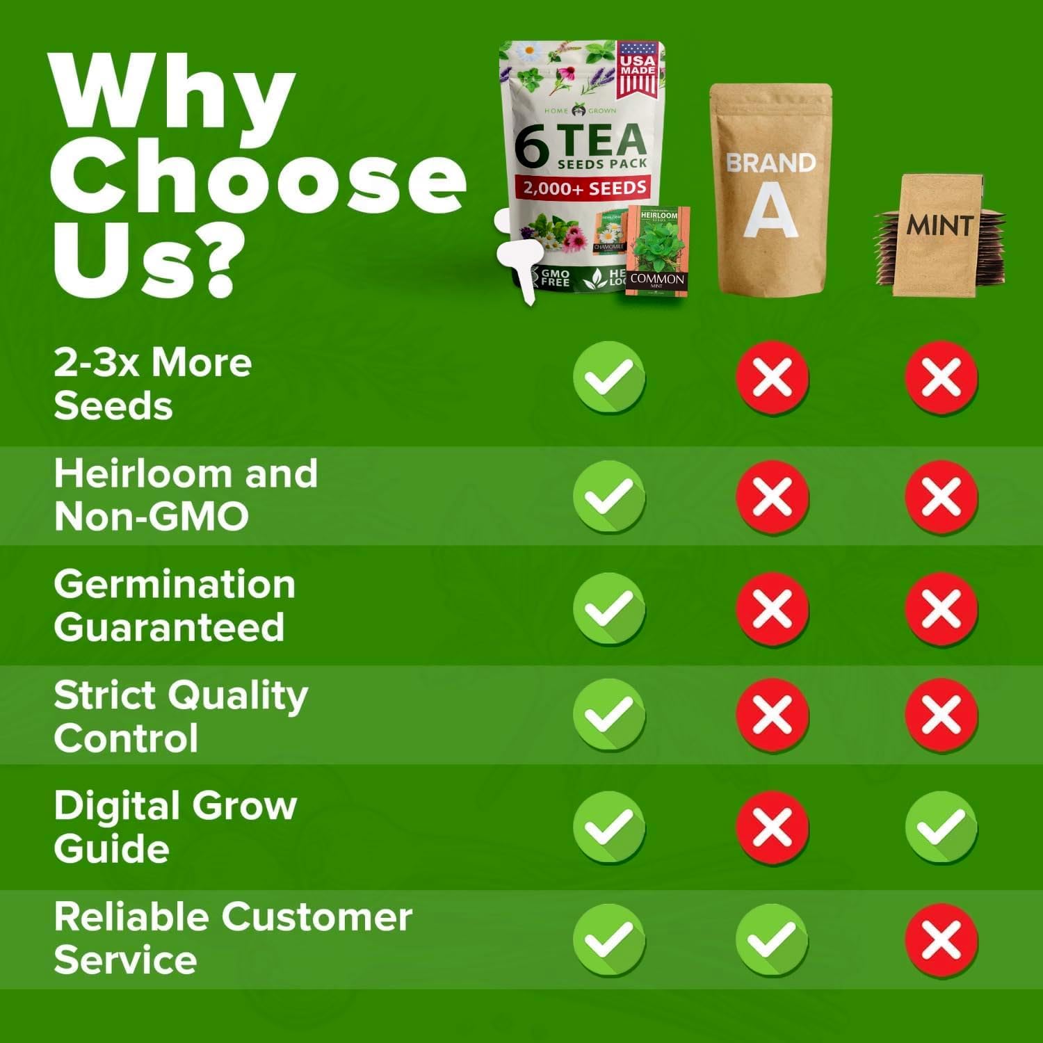 • 6 VARIETIES of Herbal Tea Seeds - Has everything you need to grow your very own tea garden. Make the freshest herbal teas straight from your own garden with these seeds: German Chamomile, Vera Lavender, Common Mint, Lemon Balm, Peppermint, Purple Coneflower Echinacea