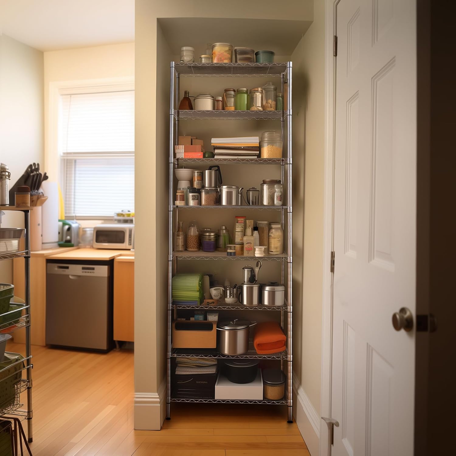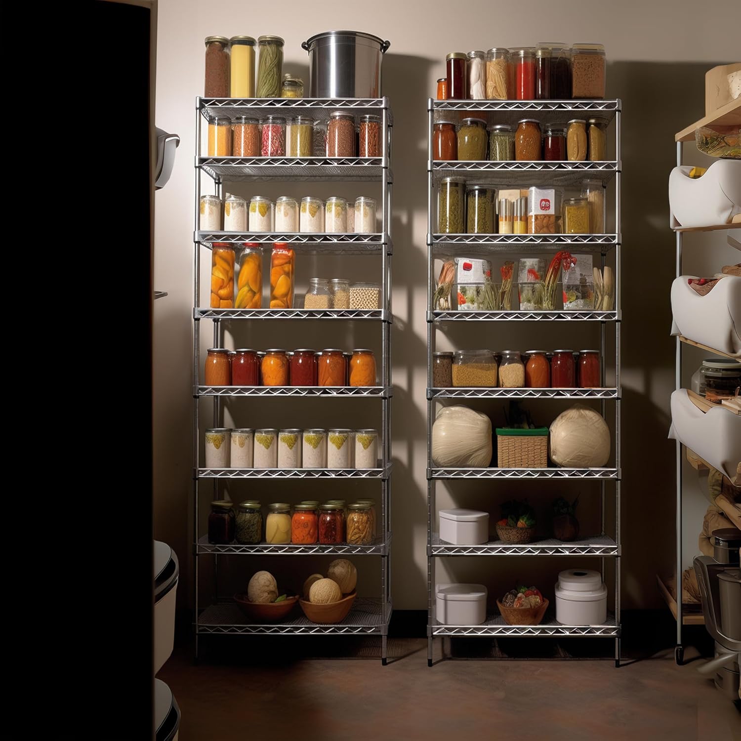 • RELIABLE & STURDY CONSTRUCTION - NSF Certified to ensure the quality. 250 lbs loading capacity per shelf with leving feet (evenly distributed) totally 2000 lbs, perfect for home use. Wire shelves adjustable in 1-inches to meet your different storage needs.