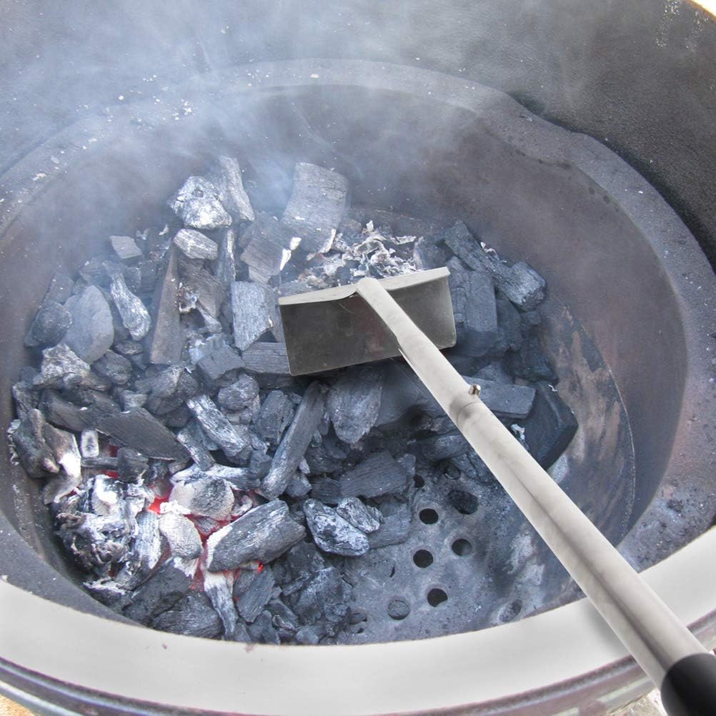 • SAFELY MOVE AND ARRANGE HOT COALS - Using this ash rake makes it easier to move and mix your hot coals around which saves a lot of time and also helps you create or switch the temperature zones, keep them evenly lit on your grill; Fit for cleaning out wood stoves ash, fireplaces and Big Green Egg, Kamado Joe, Weber Kettle and other charcoal smoker