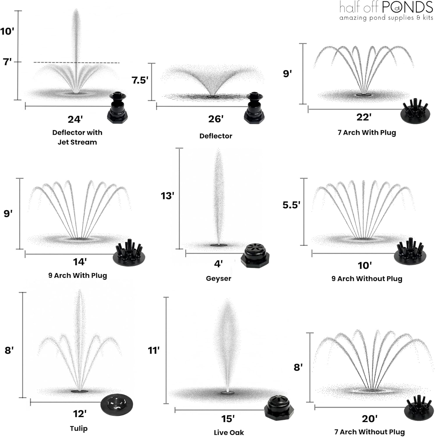 • Customizable Spray Patterns – Includes a quick-release nozzle flange and 9 interchangeable fountain spray patterns to enhance your landscape and match your pond’s style.