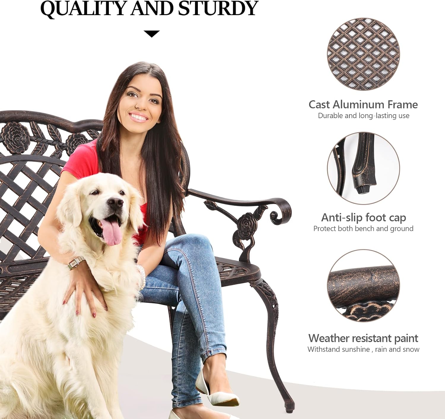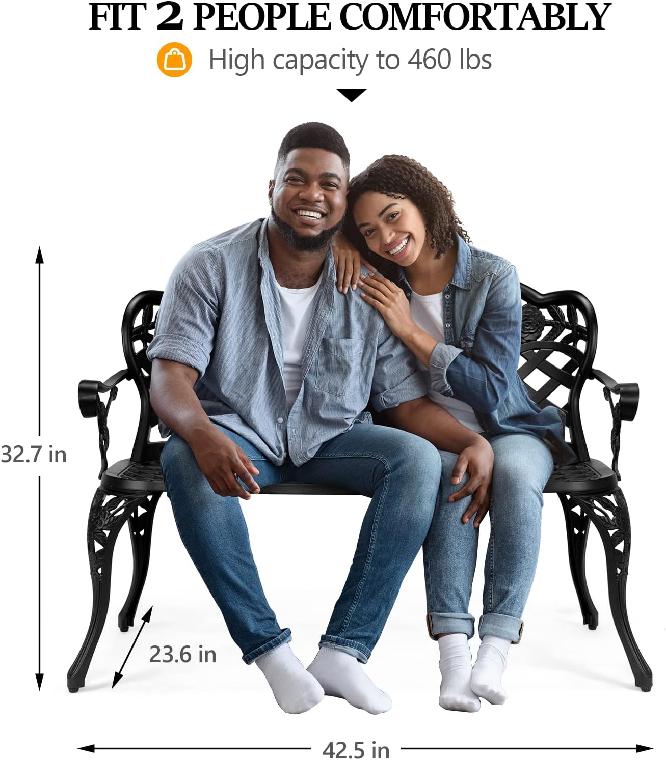 VINGLI 42.5" Patio Garden Bench Outdoor Metal Rose Loveseat, Cast Iron Cast Aluminium Frame Antique Finish Park Chair, Accommodates 2-3 People
