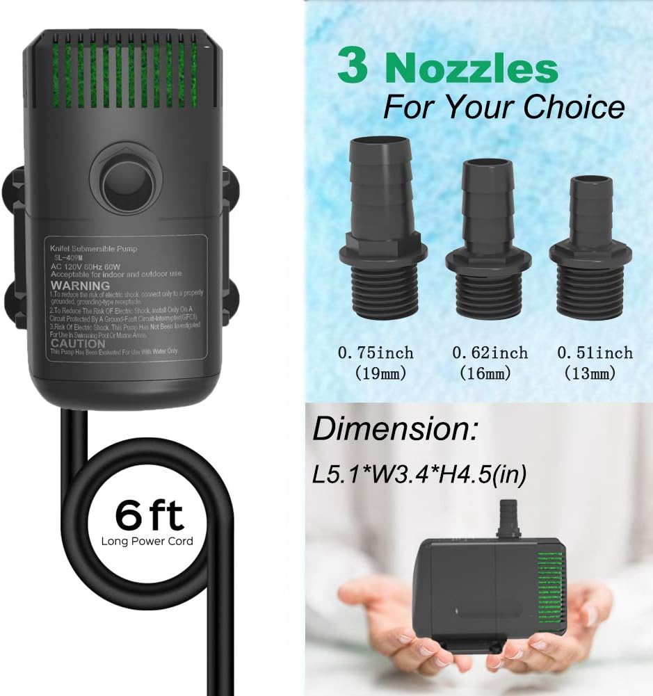 • 【WIDE APPLICATION】 Circulate and aerate the water, making it more attractive to your fish or turtles. This submersible pump is perfect for aquarium, fountains, spout and hydroponic systems, etc.