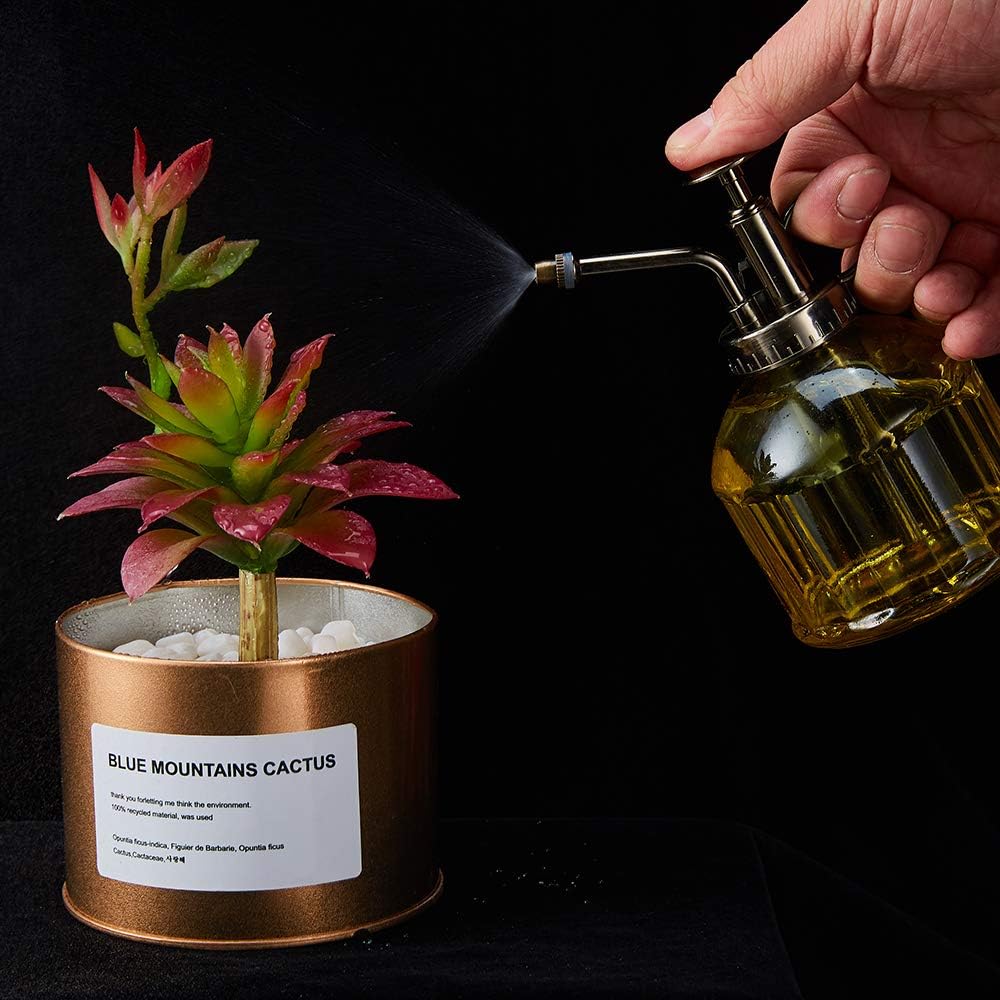 • Succulent mister material: thickened glass container + plastic painted metallic top pump.