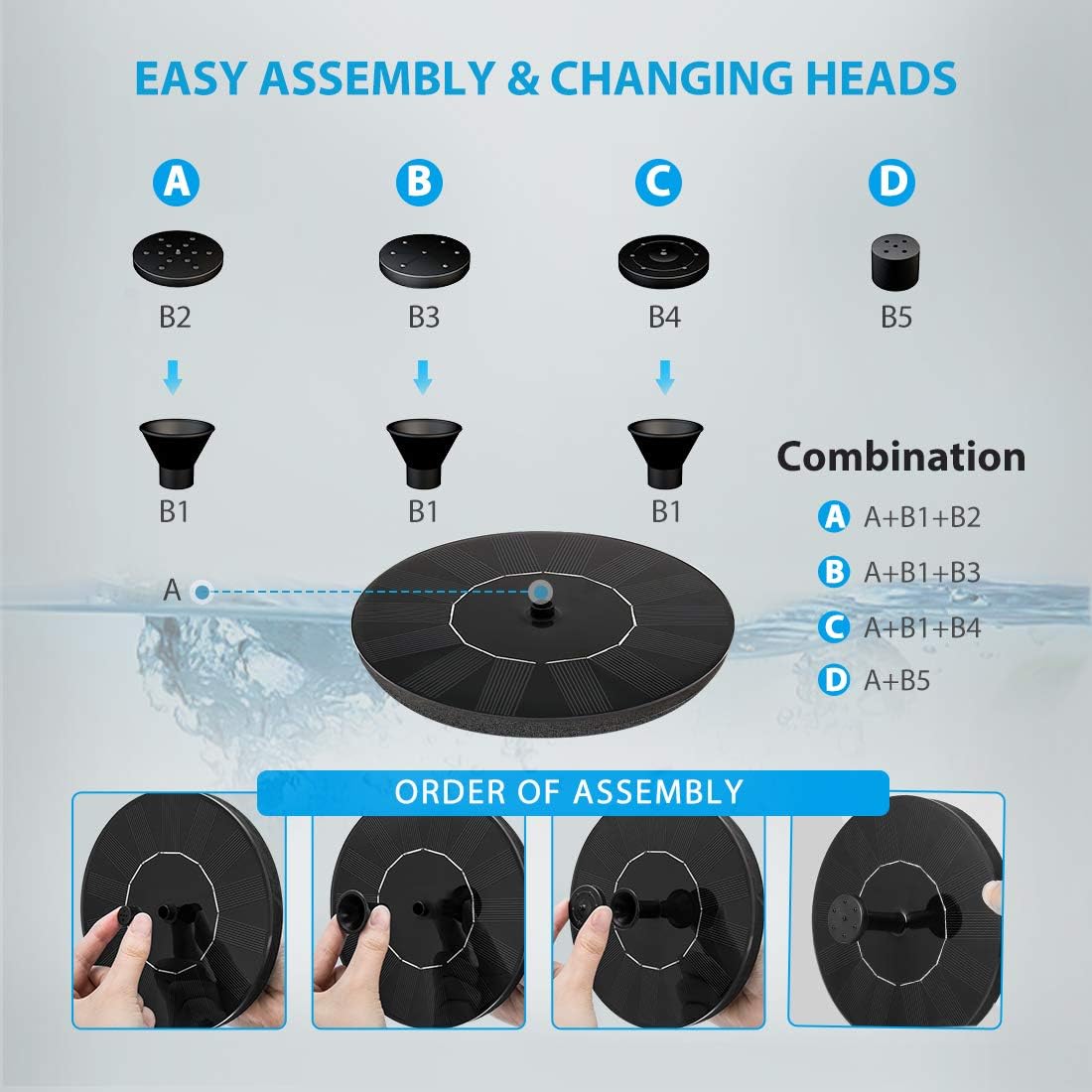 • MULTIPLE WATER PATTERNS - Multiple fountain heads for different water patterns; Easy assembly and exchanging of heads; Please kindly ensure sufficient water supply in smaller water features, especially on sunny days