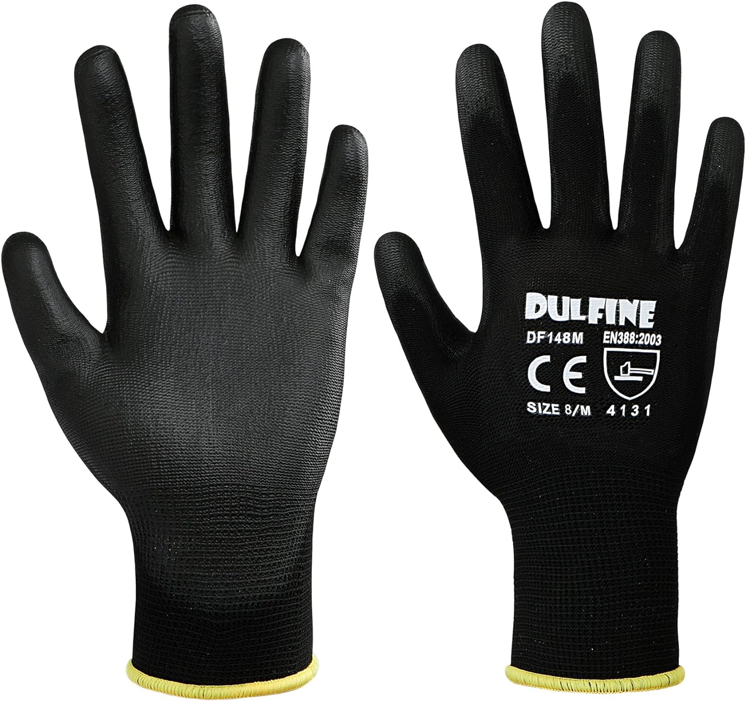 DULFINE Ultra-Thin PU Coated Work Gloves-12 Pairs,Excellent Grip,Nylon Shell Black Polyurethane Coated Safety Work Gloves, Knit Wrist Cuff,Ideal for Light Duty Work. (Small)