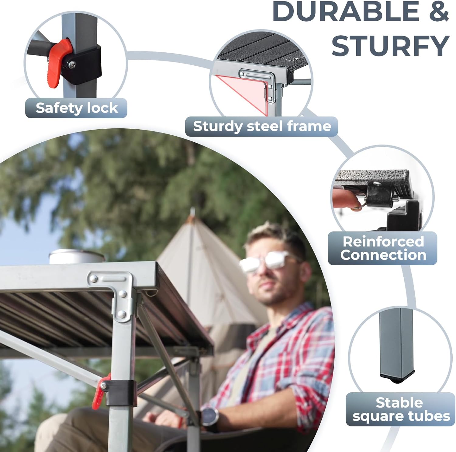 • 【Durable Aluminum Camping Table】This folding table camping is made of thicker aluminum alloy and anodized treatment, which is rust free, corrosion-resistant,easy to clean. The aluminum grill table adopts metal material contact point and triangular steel structure design to ensure stable use.