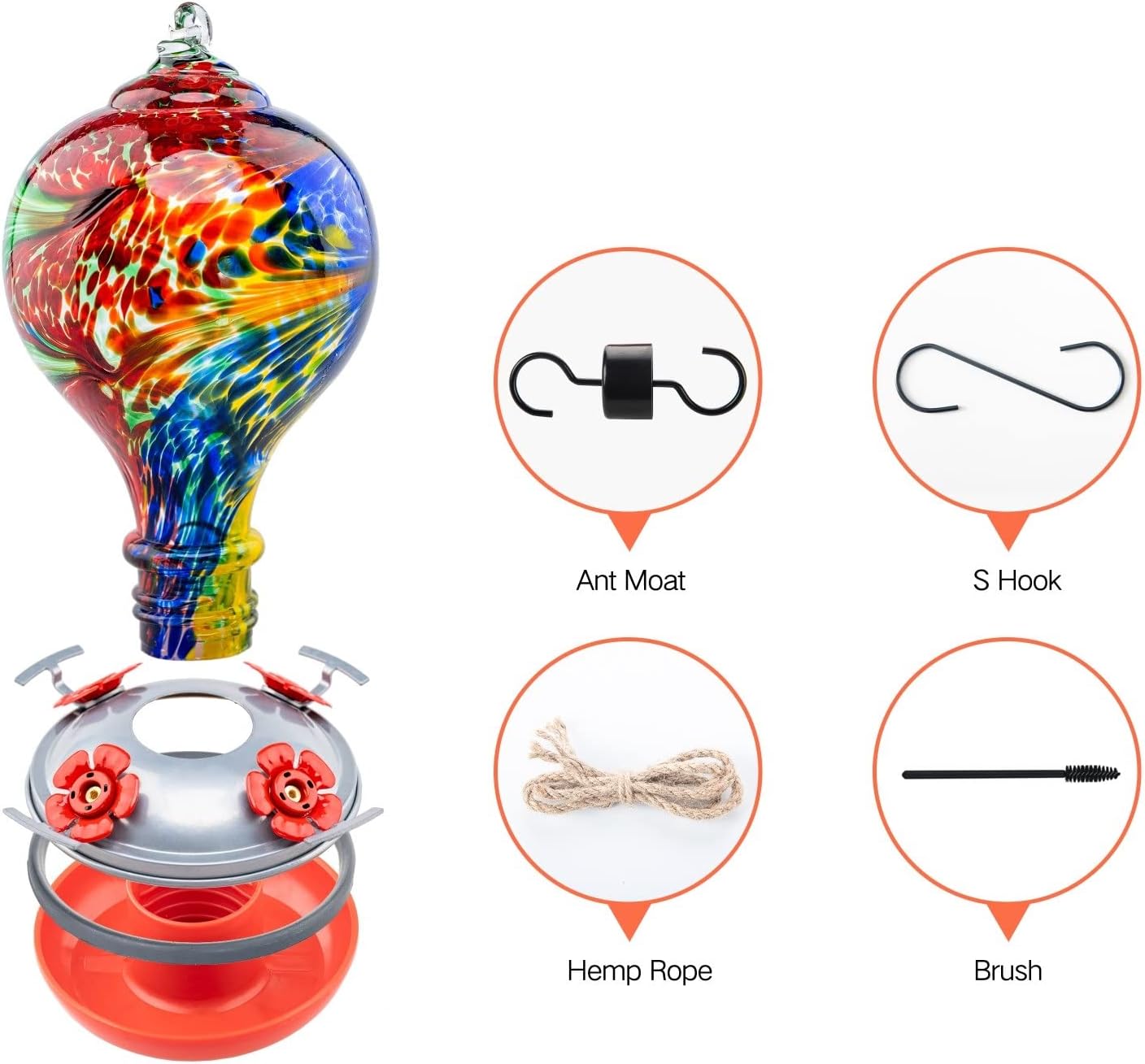 • CONVENIENT TO USE: bird feeder including user manual,1 ant moat, 1 S hook, 1 hemp rope (to hang the bird feeder), and 1 brush (to clean the feeding hole). Easy to assemble, fill, and clean.