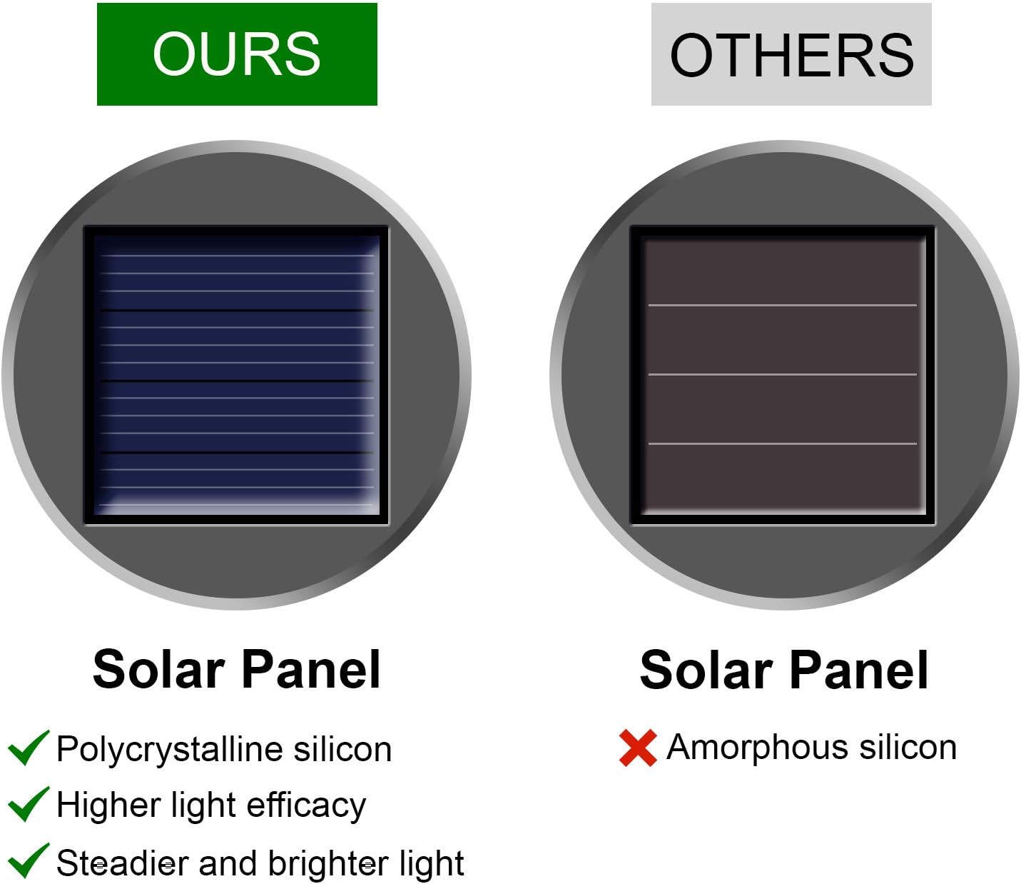 • 【Better Solar Panel】Unlike other outside solar hanging light panels made of Amorphous silicon, Our solar lights are made of Polycrystalline silicon which has higher light efficacy. With the same charging hours, our solar panels can save more electricity in the daytime and casts brighter and steadier glow at night.