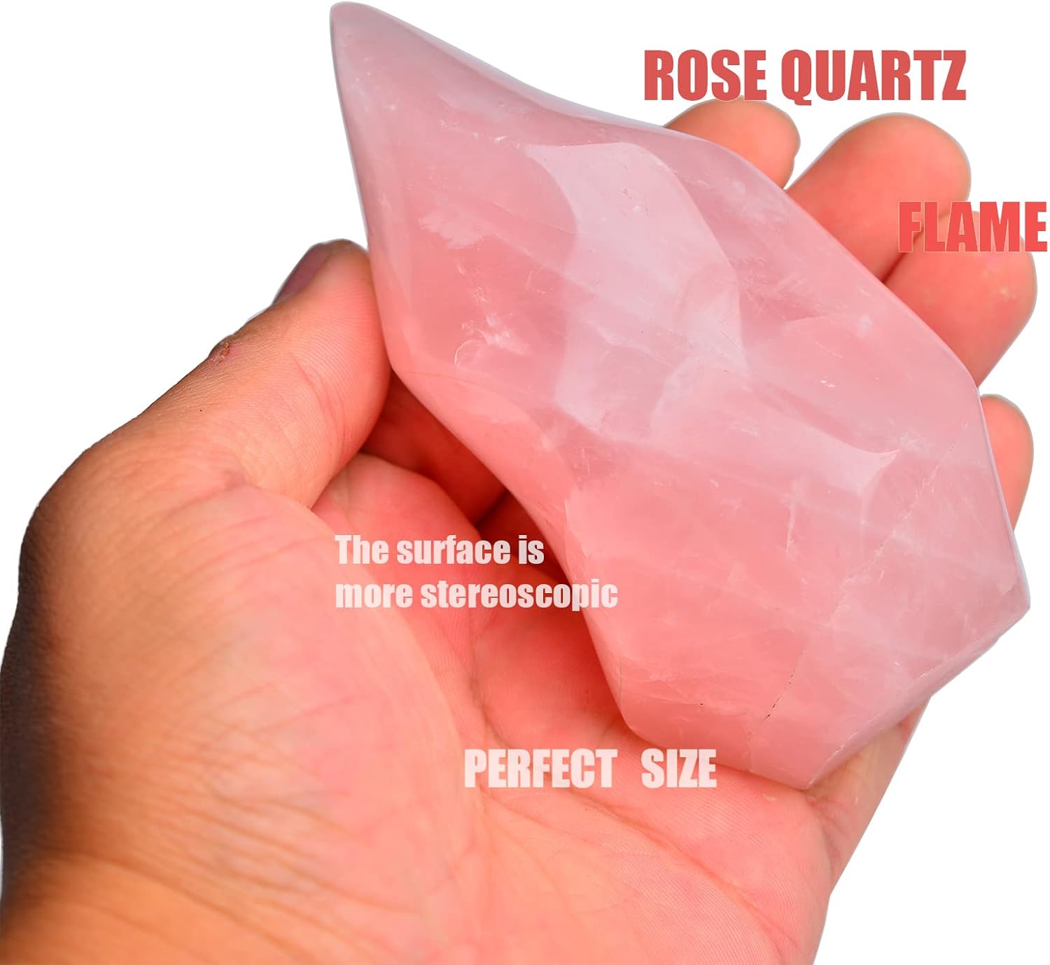 • Size: about 3.5-5.5" tall, 1.35-3.5" wide, 0.6-1.0 LBS weight, its shape is like a flame. the actual size and color are a bit different from each other, we will send by random from available lot. Rose Quartz 01 is more three-dimensional than 02.