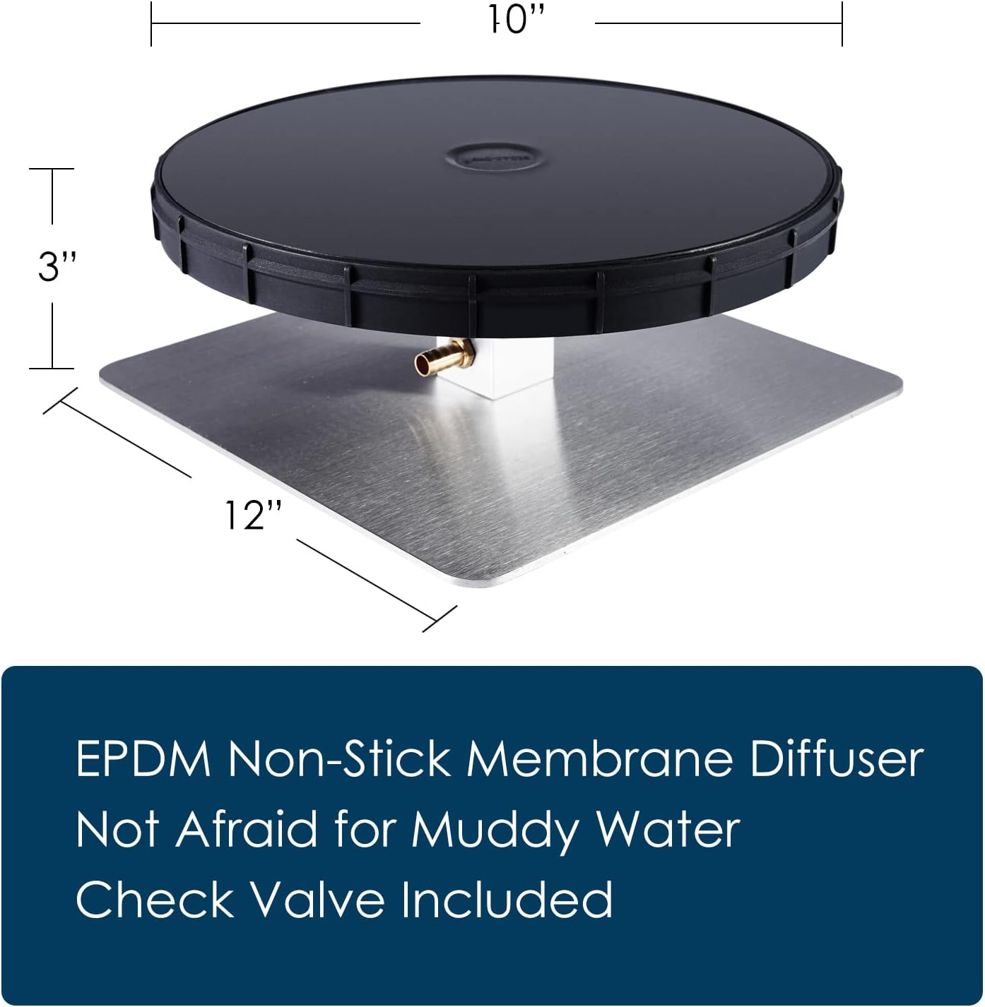 • EPDM non-stick 10” membrane diffuser. 12” square stainless steel base for the diffuser’s stability.