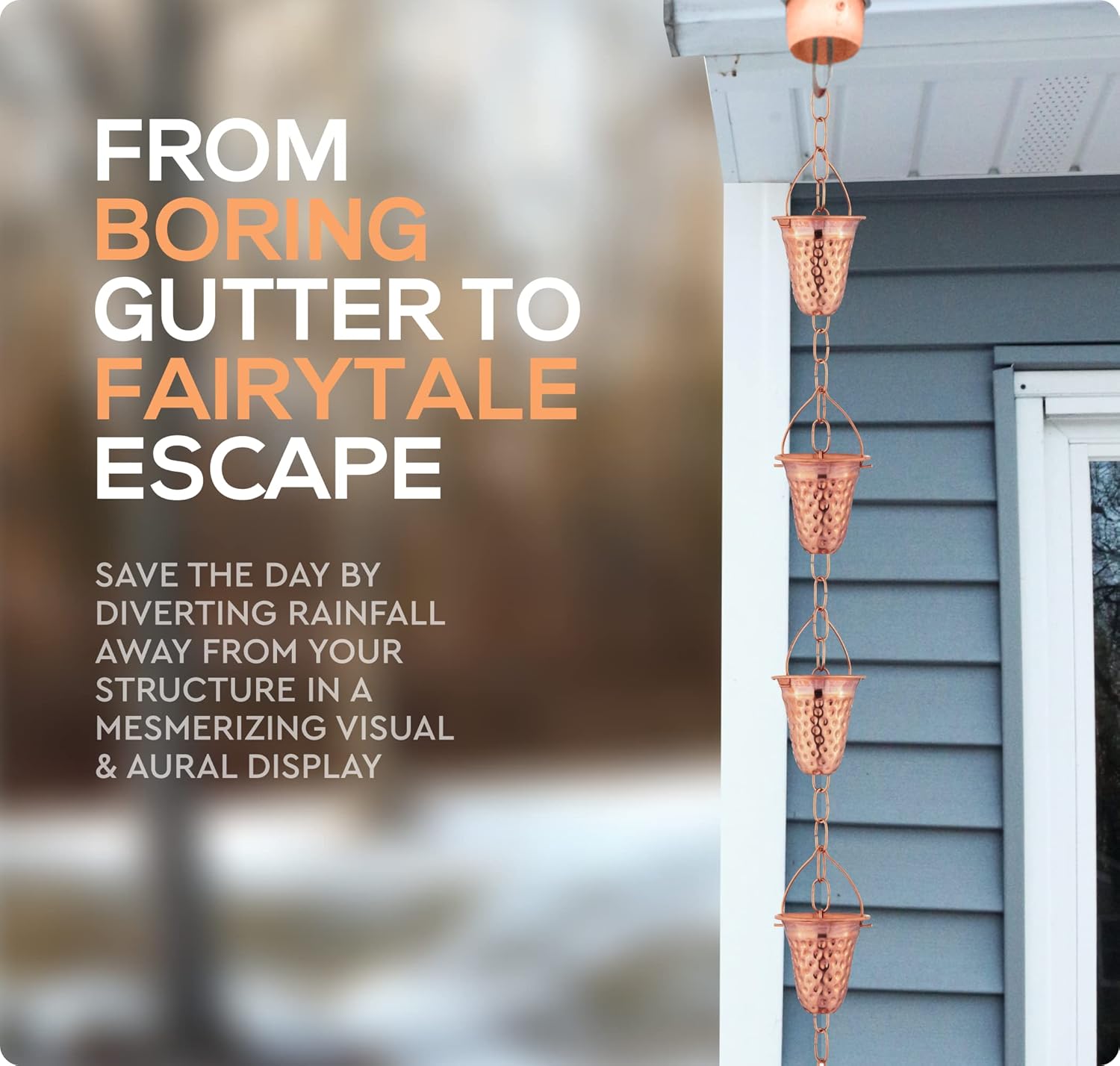 • ENCHANTING GARDEN RAIN CHAINS – Gorgeous Chimes & Cups Make a Beautiful Alternative to Ugly Downspouts – Hang From the Gutter & Watch the Water Collect & Direct Away from Your House in a Lovely Cascading Waterfall Display