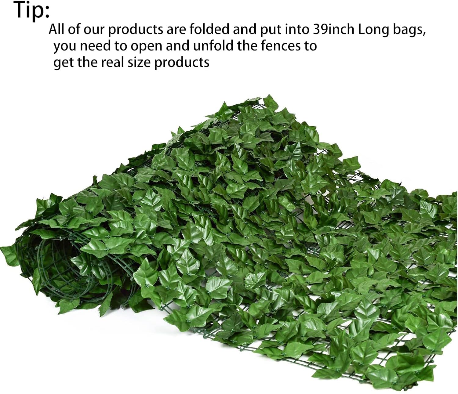 • Realistic green Ivy look: Artificial ivy leaves are natural looking to provide every indoor or outdoor space a blooming, earthy feel without the need for watering,Use zip ties or tape to install, it can be cut to get the size and shape you want, can be used as wall decoration, fence, privacy screen.Tip:All of our products Size are folded and put into 39inch Long bags, when you receive the product, you need to open and unfold the fences to get the real size products.