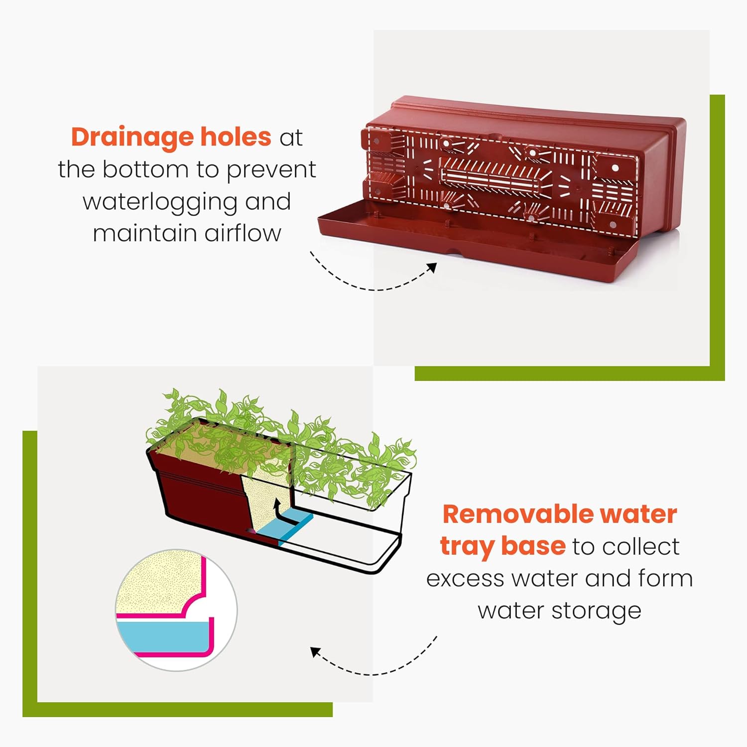 • Innovative Drainage System with Water Tray: Our innovative window sill planters are equipped with strategically placed drainage holes to ensure adequate airflow and prevent water clogging. This plant pot includes a water tray to catch excess water that plants can reuse, making it a self-watering pot.