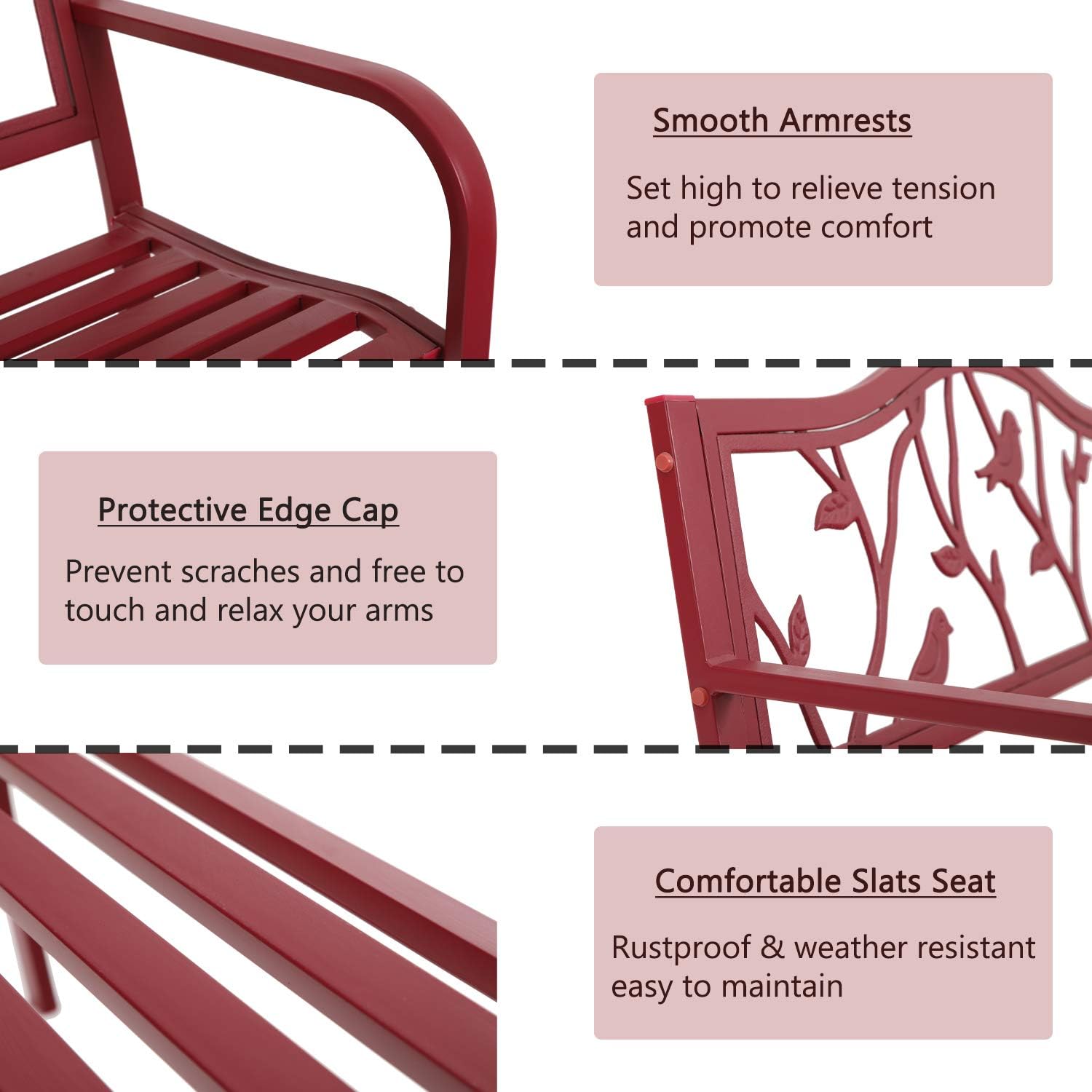 MFSTUDIO 50" Outdoor Red Garden Bench, Steel Metal Frame Patio Park Bench with Bird Pattern Backrest for Porch Backyard Lawn